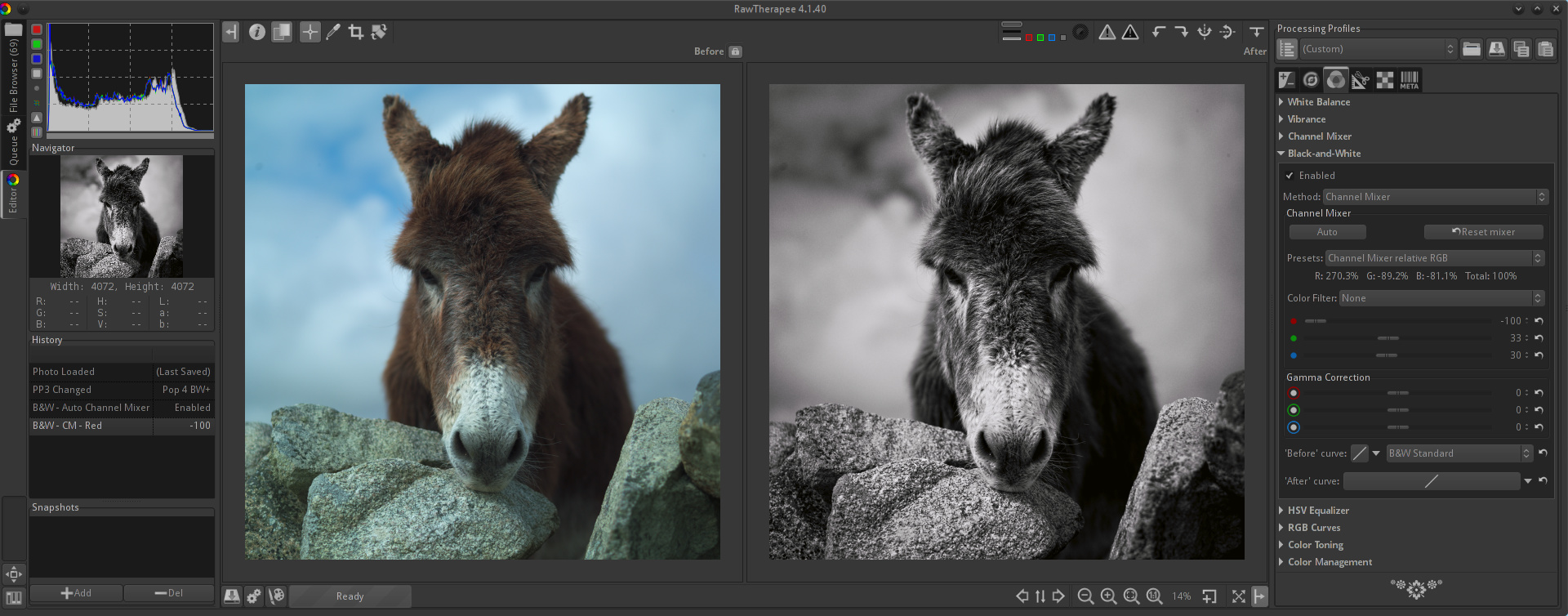 The Black-and-White tool gives you great control over the process of converting a color image into a black-and-white one.