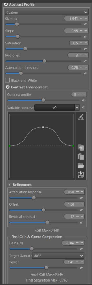 - At the same time, these presets progressively weaken the action of the “Variable contrast” curve as you move the “Contrast profile” slider to the right.