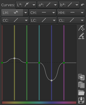 You can save a curve for later use by clicking on the disk button. Note that only the actual (shown) H, S or V curve is saved, not all three at once, so don’t give your curve a name like my_hsv because it doesn’t describe whether the curve inside it is H, S or V, but instead name your saved curve files something like my_hue, my_sat and my_val. The extension will be added automatically, “.rtc”.