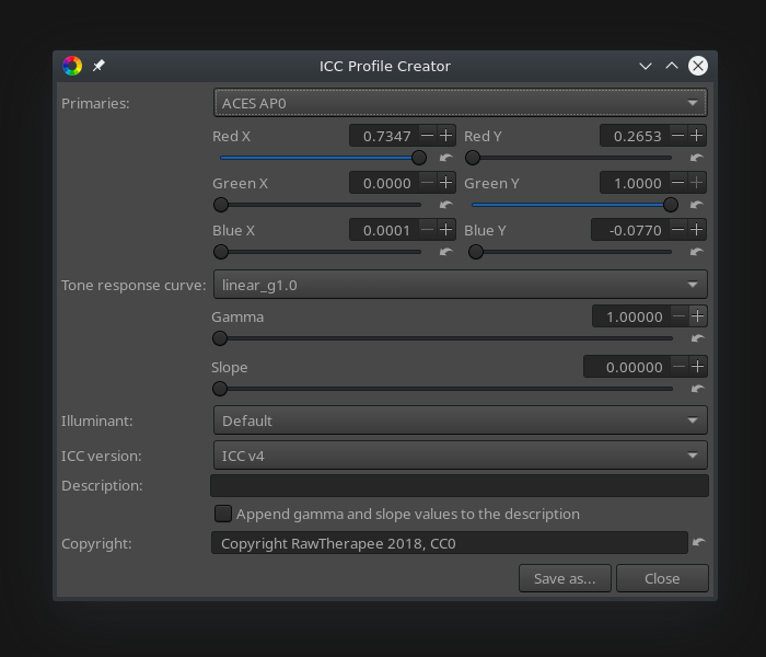 The ICC Profile Creator allows you to generate your own ICC profiles. You can use standard presets as well as custom values.