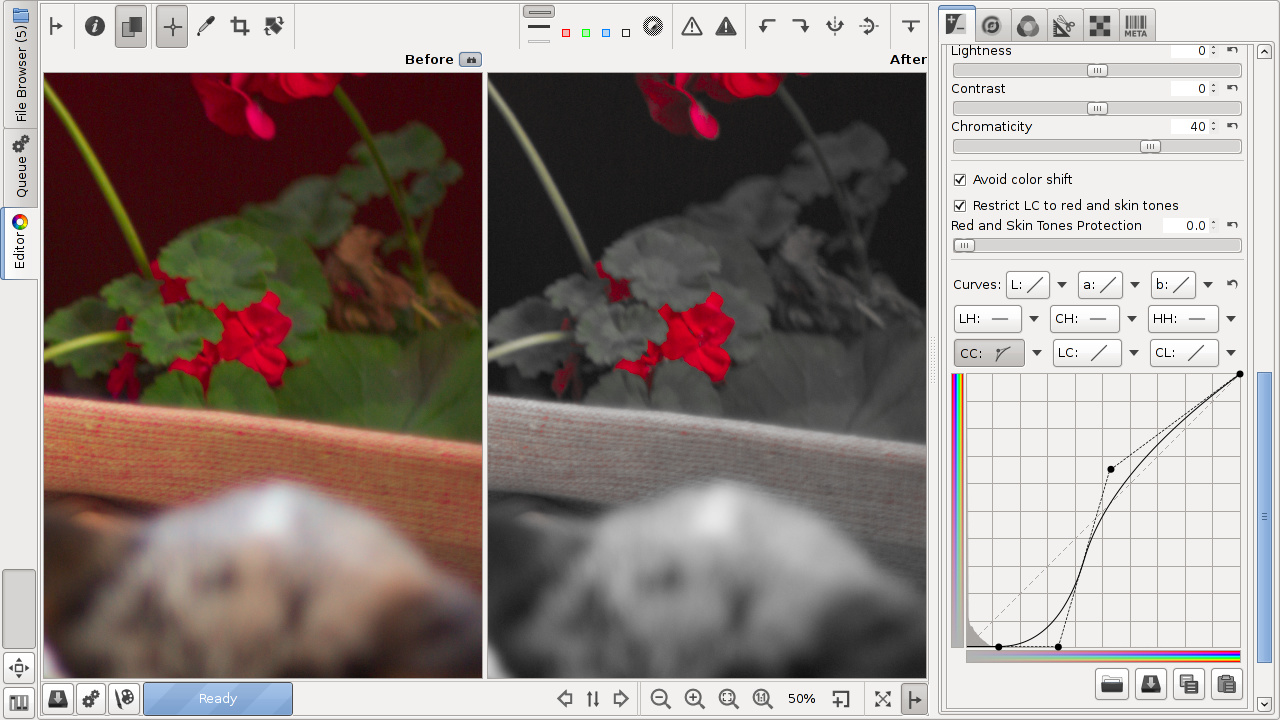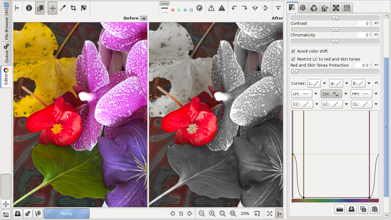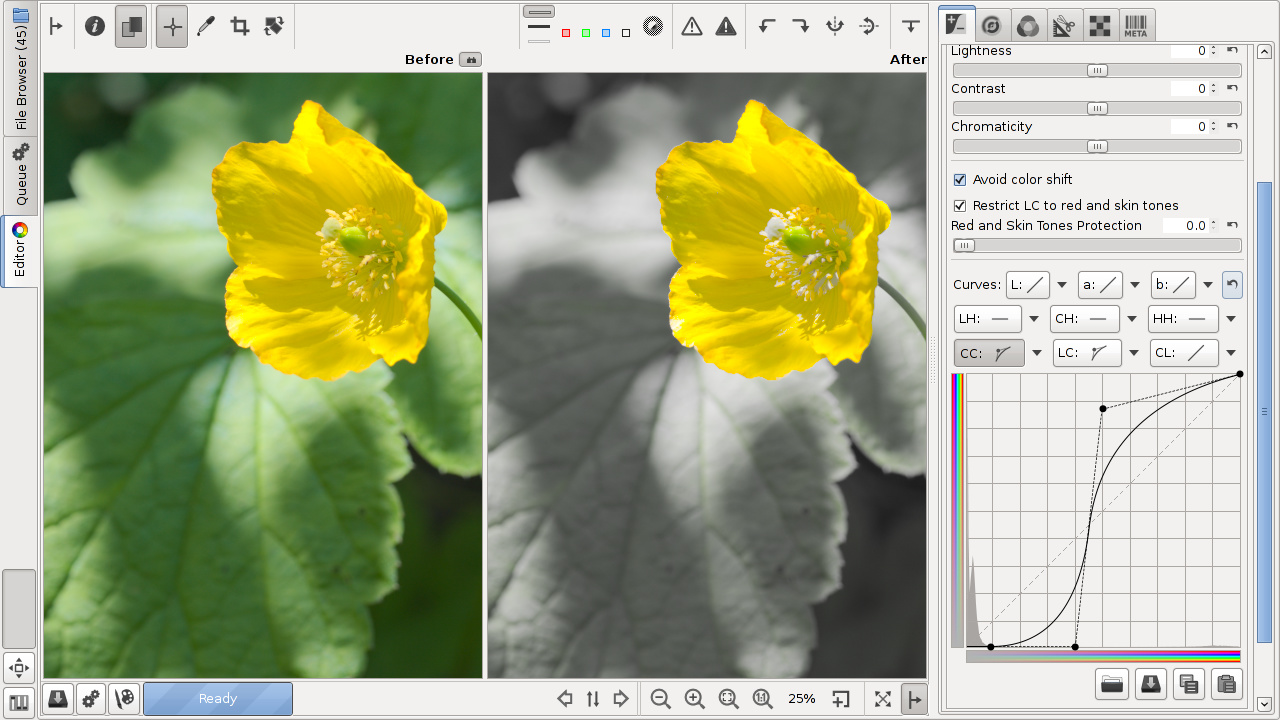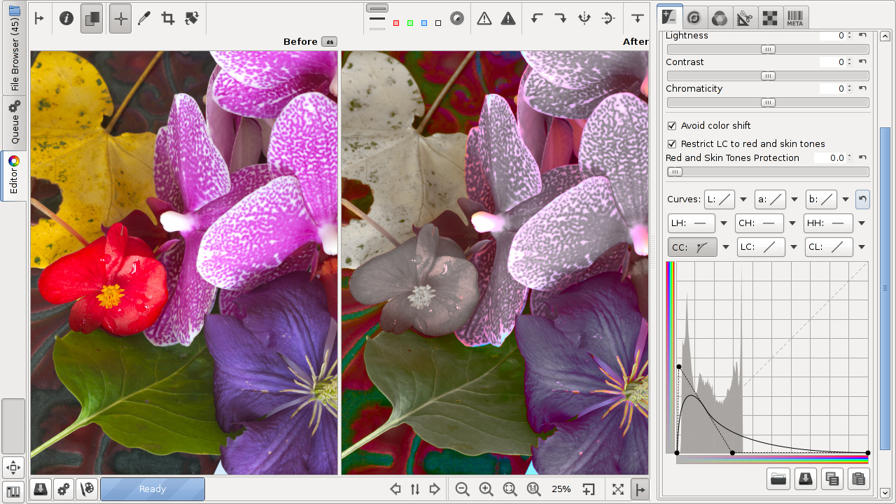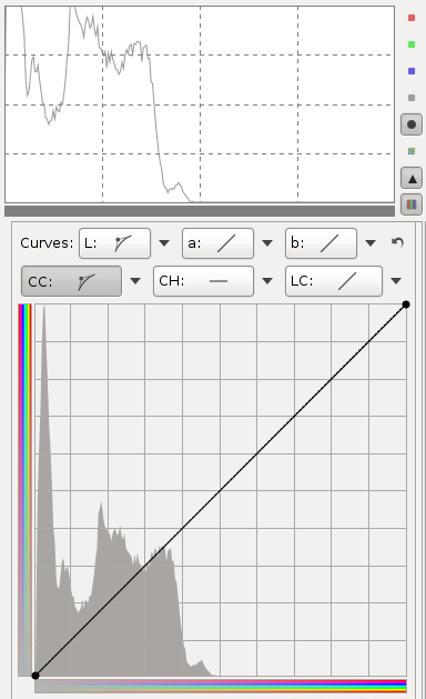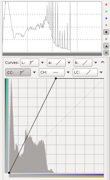 The CC curve (chromaticity according to chromaticity) allows to control output chromaticity based on the input chromaticity, C=f(C). The histogram on the CC curve reflects chromaticity before the adjustment. This allows you to separately adjust the chromaticity of pixels of low and high saturation, so you can boost saturation where needed without causing already saturated zones to clip.