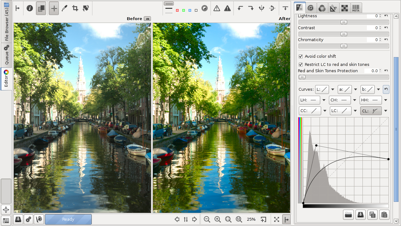To find the maximum chromaticity boost you can apply without causing nasty spikes, which will appear as sudden flat regions of color in the image, similar to posterization, all you need to do is click Show/Hide chromaticity histogram if you haven’t done so already, and then slowly boost chromaticity until you notice the histogram begins to spike. The curve does not have to be linear of course.