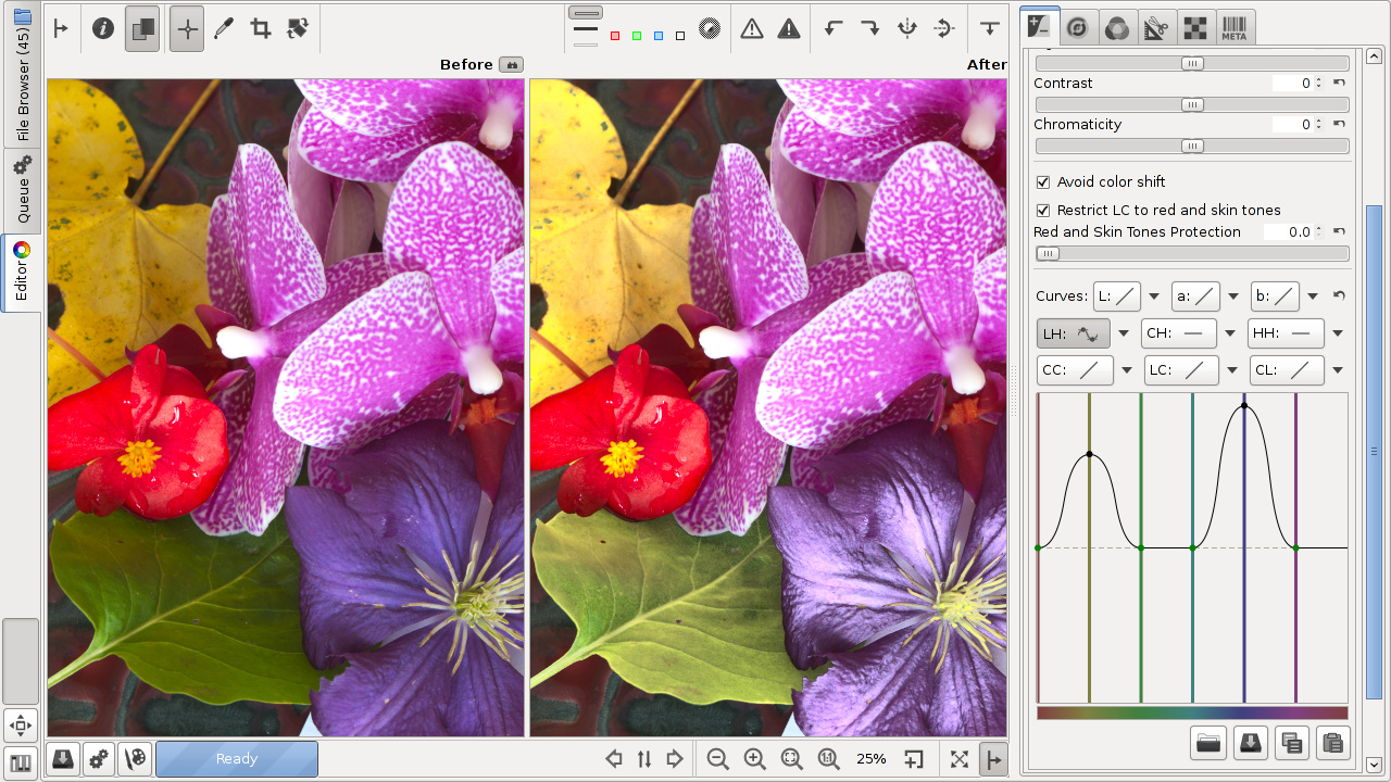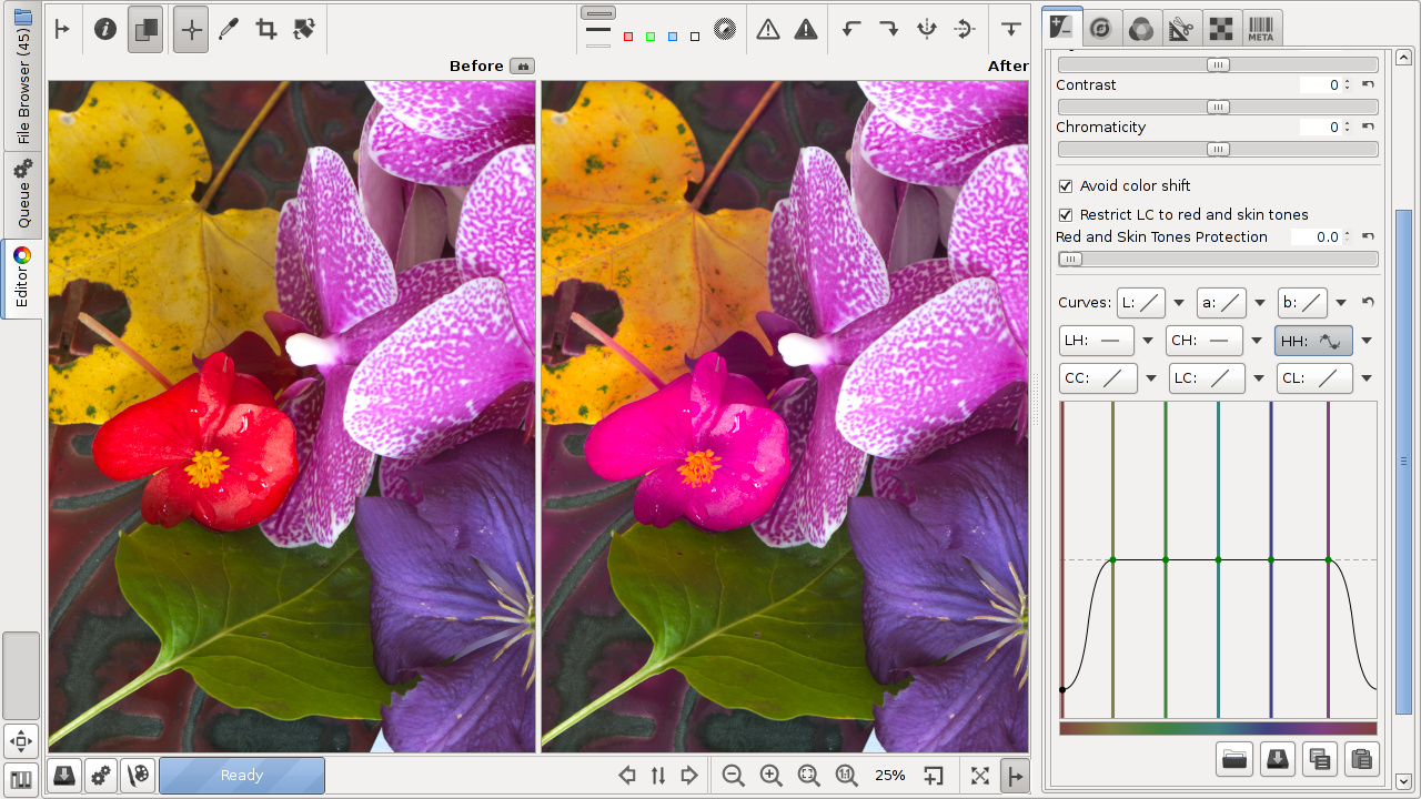 color you desire. RawTherapee has two HH curves, one in the Lab tools in