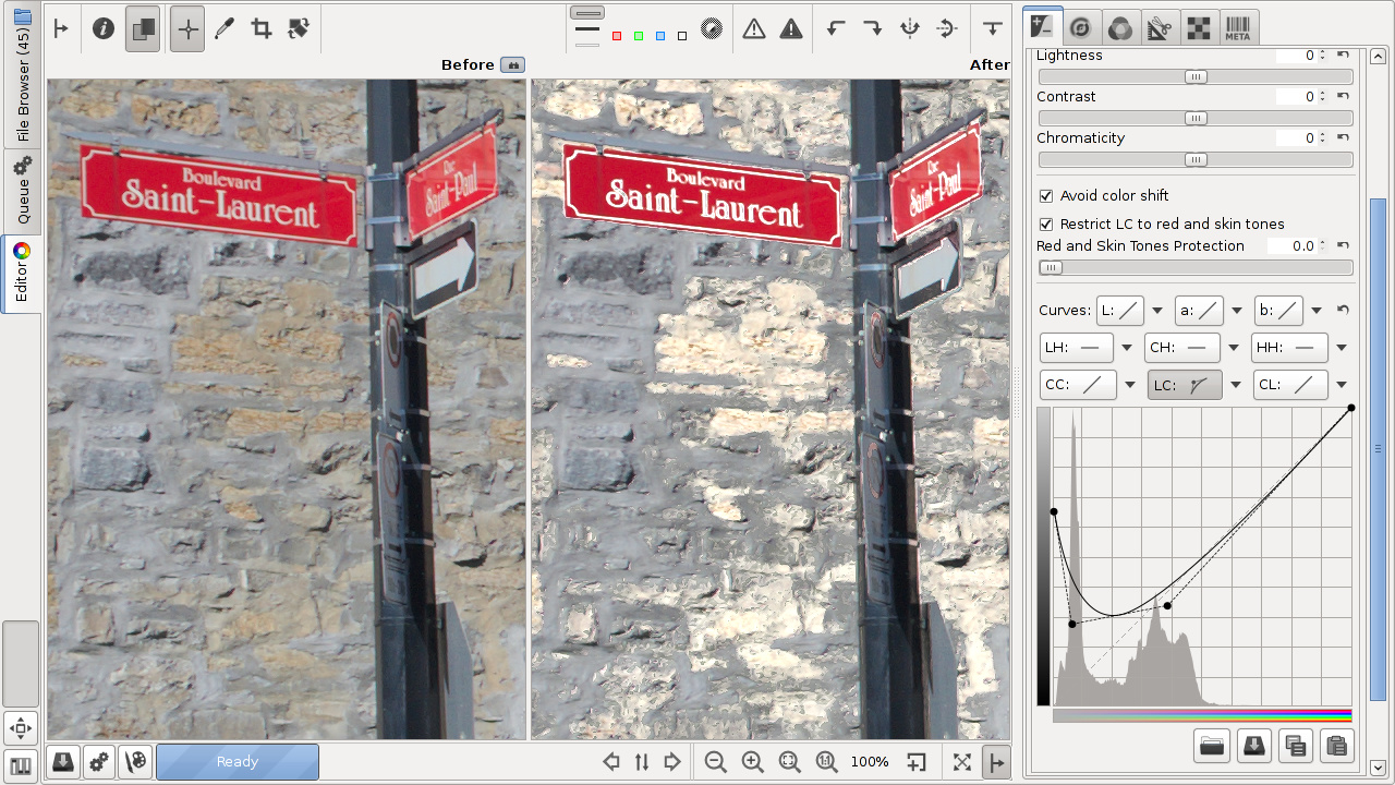 The LC curve (lightness according to chromaticity) allows to control the output lightness based on the input chromaticity, L=f(C). You can use it on portraits to lighten skin