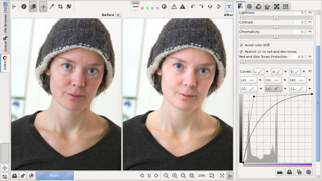 The LC curve’s action is modulated by the Restrict LC to red and skin tones checkbox. Thus the LC curve provides a complex image control, altering lightness based on image chromaticity and also targeting a specified range of hues. With this option enabled, the lightness of only red and skin tones is affected, for example allowing you to make skin fairer and conceal wrinkles and blemishes while preserving the color of the model’s clothes and background. When it is disabled, the LC curve acts on other colors as well.