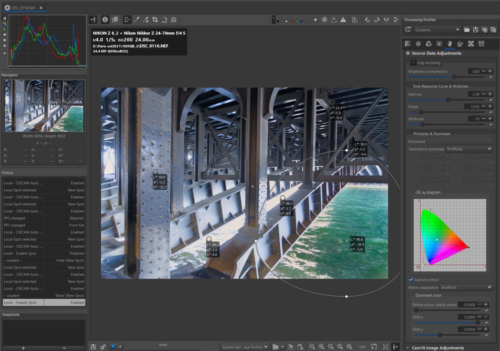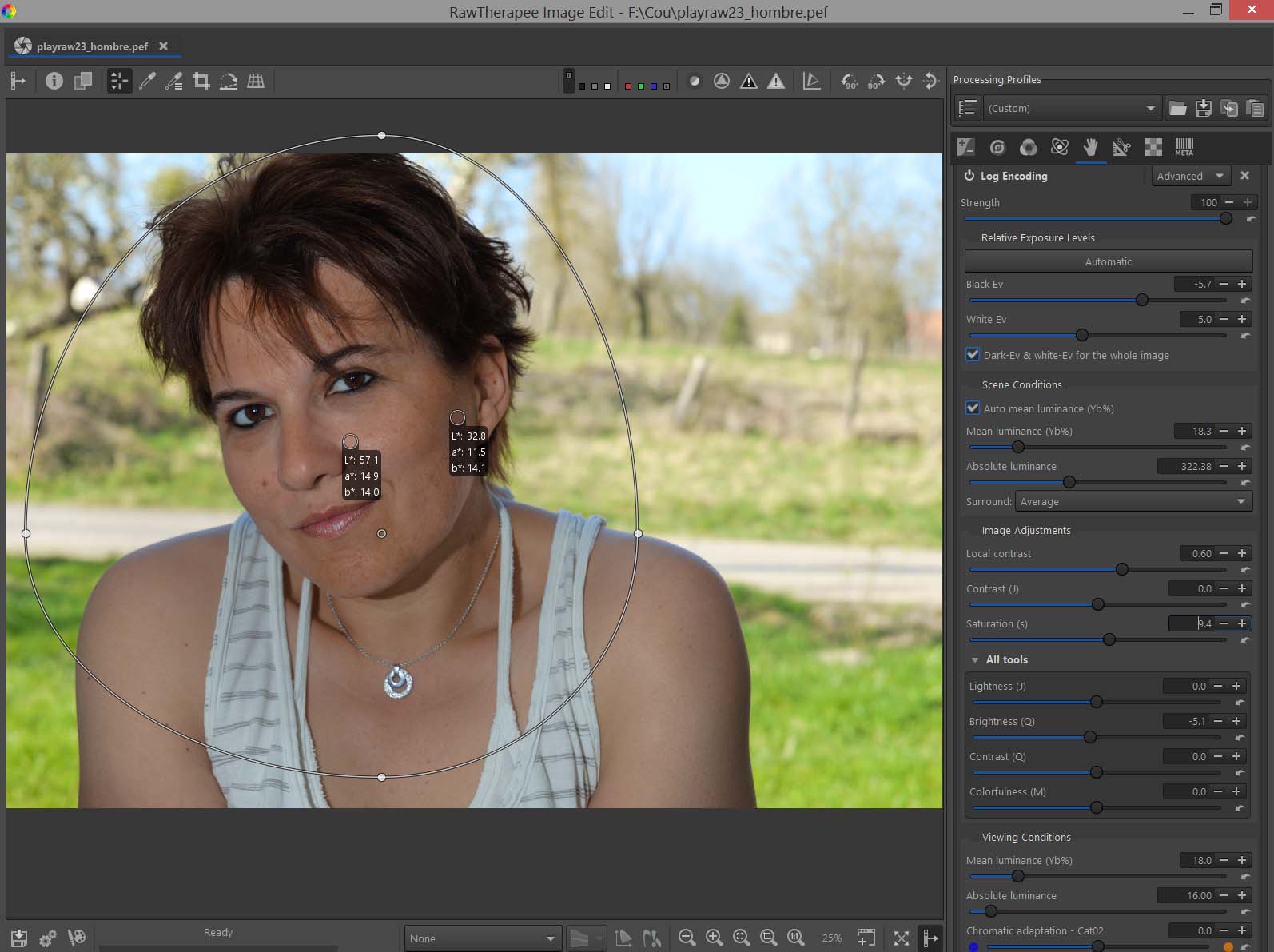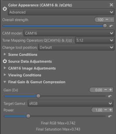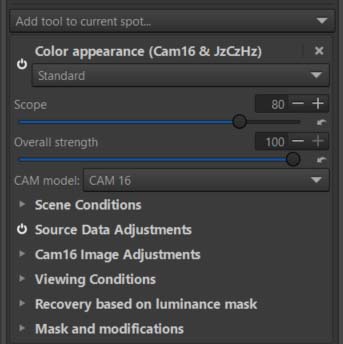 This module is a simplified version of the Color Appearance & Lighting(Ciecam02/16) module in the Advanced tab in the main menu, which has been adapted to the specific requirements of Local Adjustments. It has also been extended to take into account HDR Peak Luminance and includes an experimental JzCzHz function (in Advanced mode) to improve HDR processing.