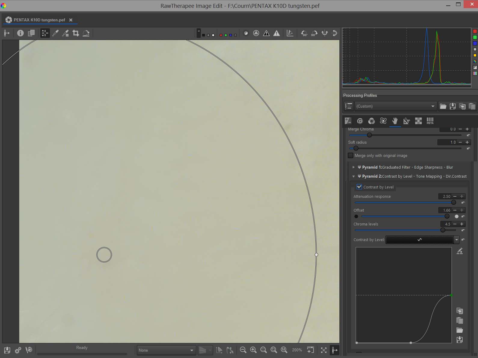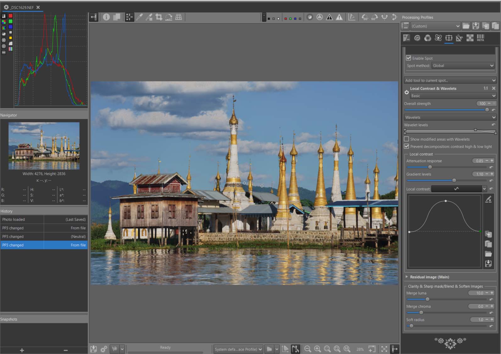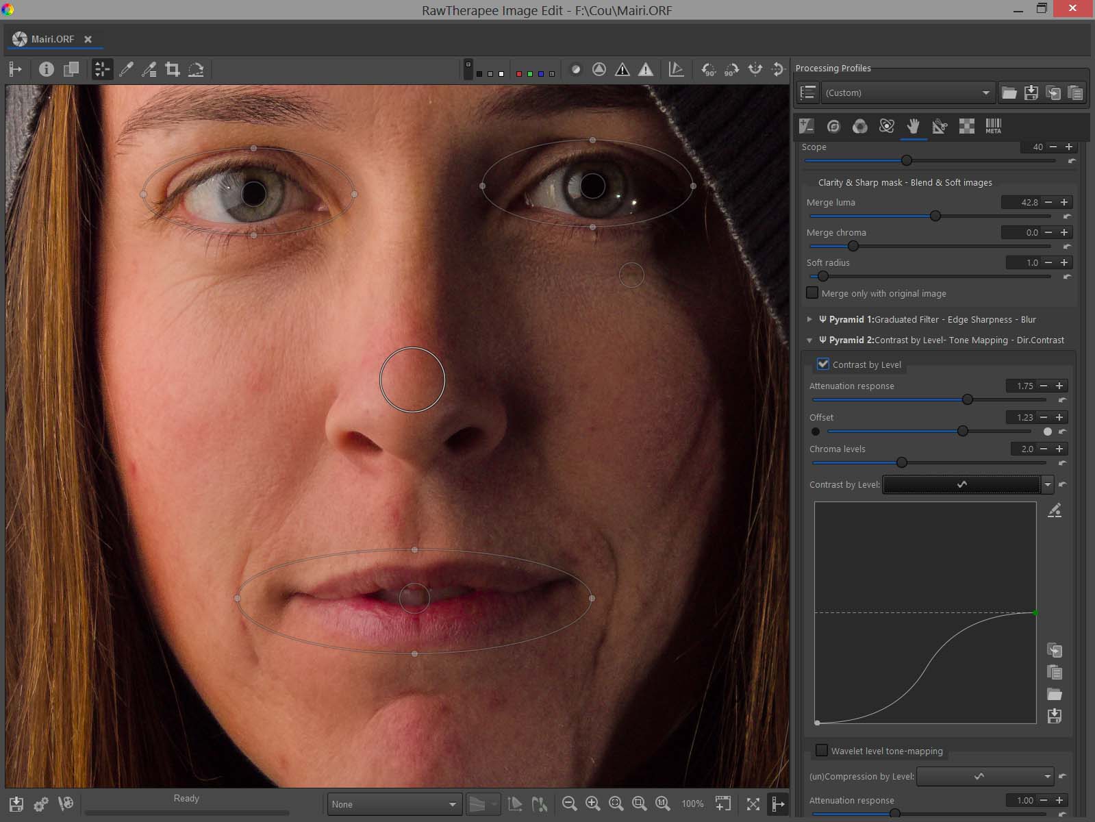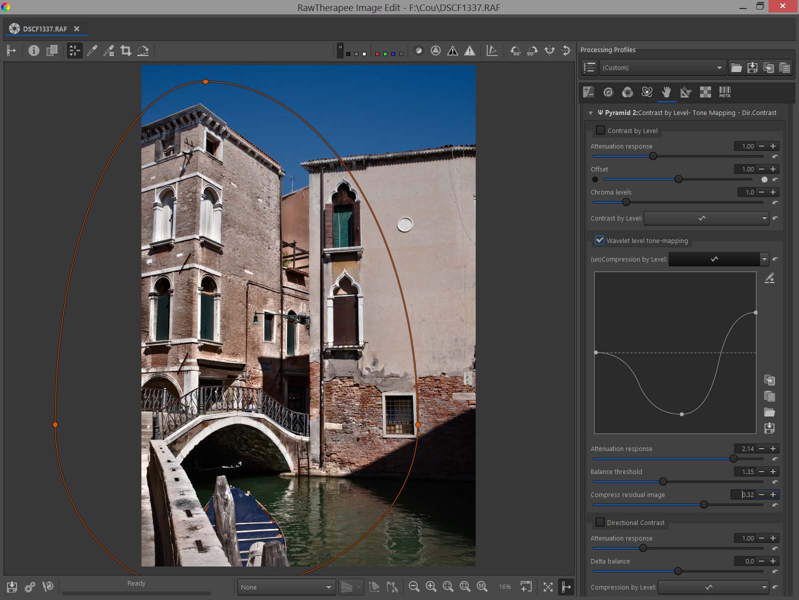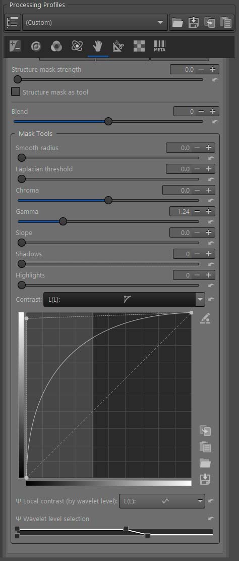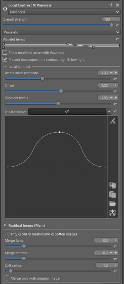 - Wavelets: based on Wavelet Levels in the Advanced tab with essentially the same features (clarity, contrast, blur, etc., see documentation). Additional features such as a Graduated Filter, Tone mapping, etc. have also been included. Its use in Local Adjustments provides additional possibilities such as the removal of large blemishes, grease stains etc.