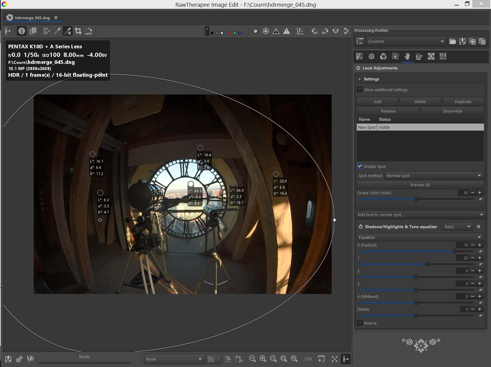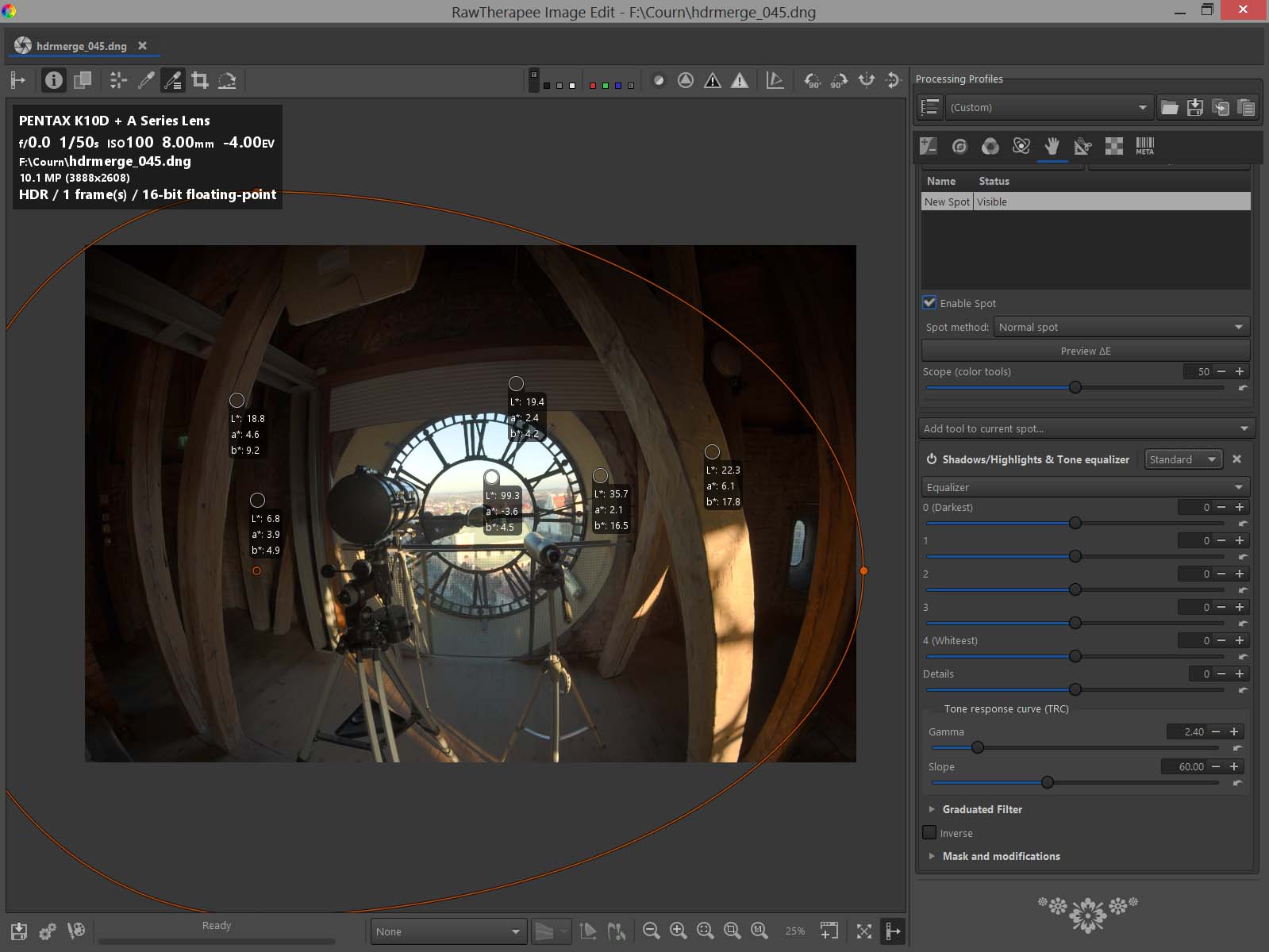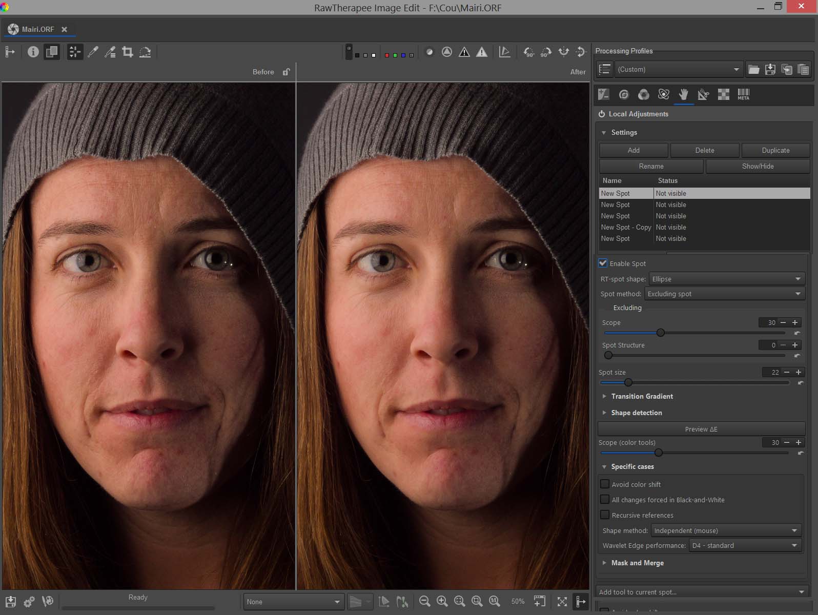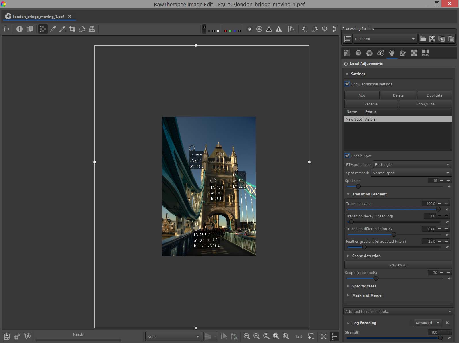 The extent to which these modifications are applied can be finely controlled allowing for very precise selections. Further refinement is possible with additional parametric masks but the shape-detection algorithms should be sufficient for the vast majority of local editing requirements. RT-spots can also be used in Excluding mode to prevent the algorithm from influencing certain parts of the image. The modifications that can be carried out are extensive and incorporate most of the functions available in RawTherapee’s global adjustment tools along with some additional tools available only in the Local Adjustments tab.