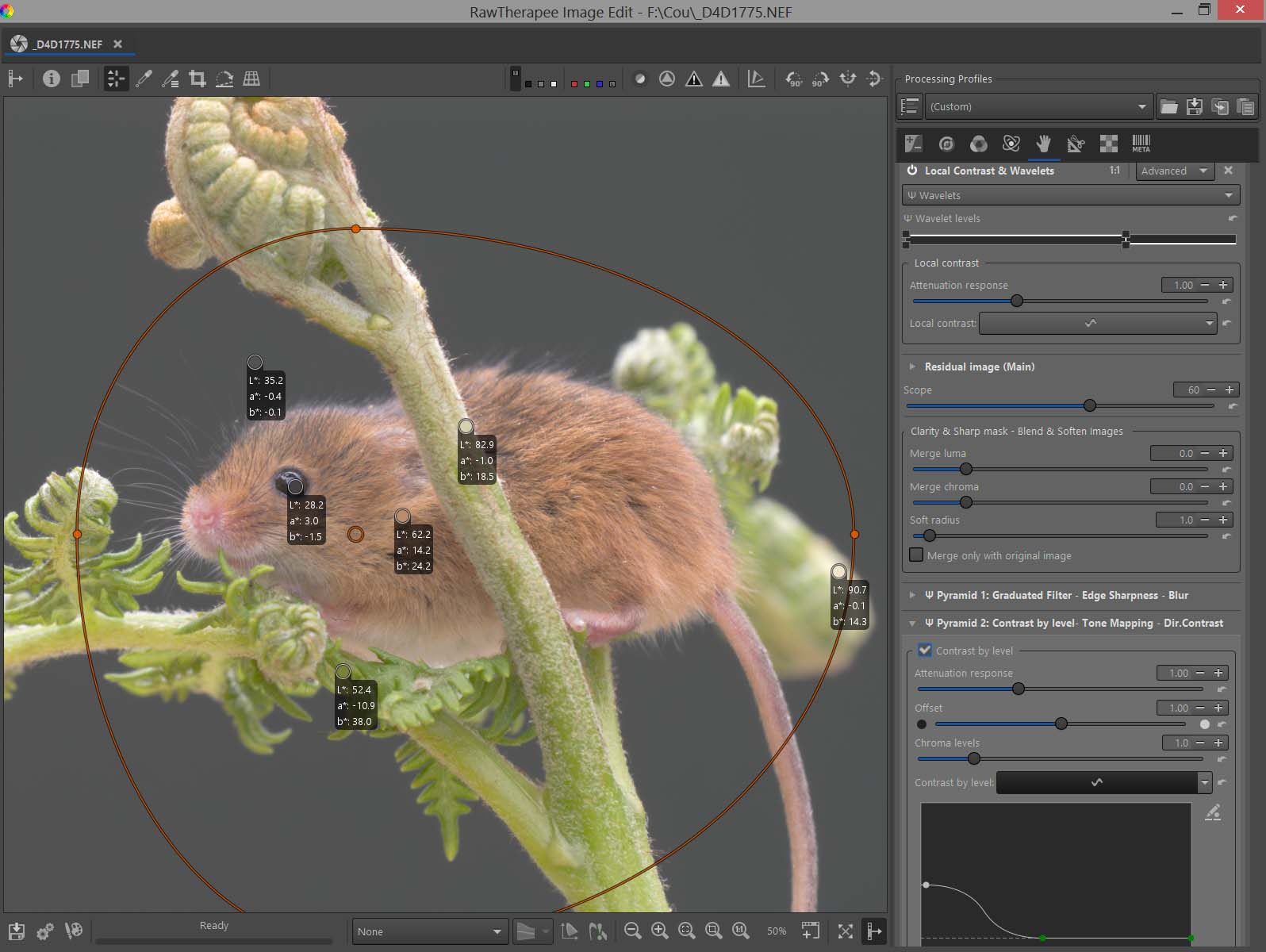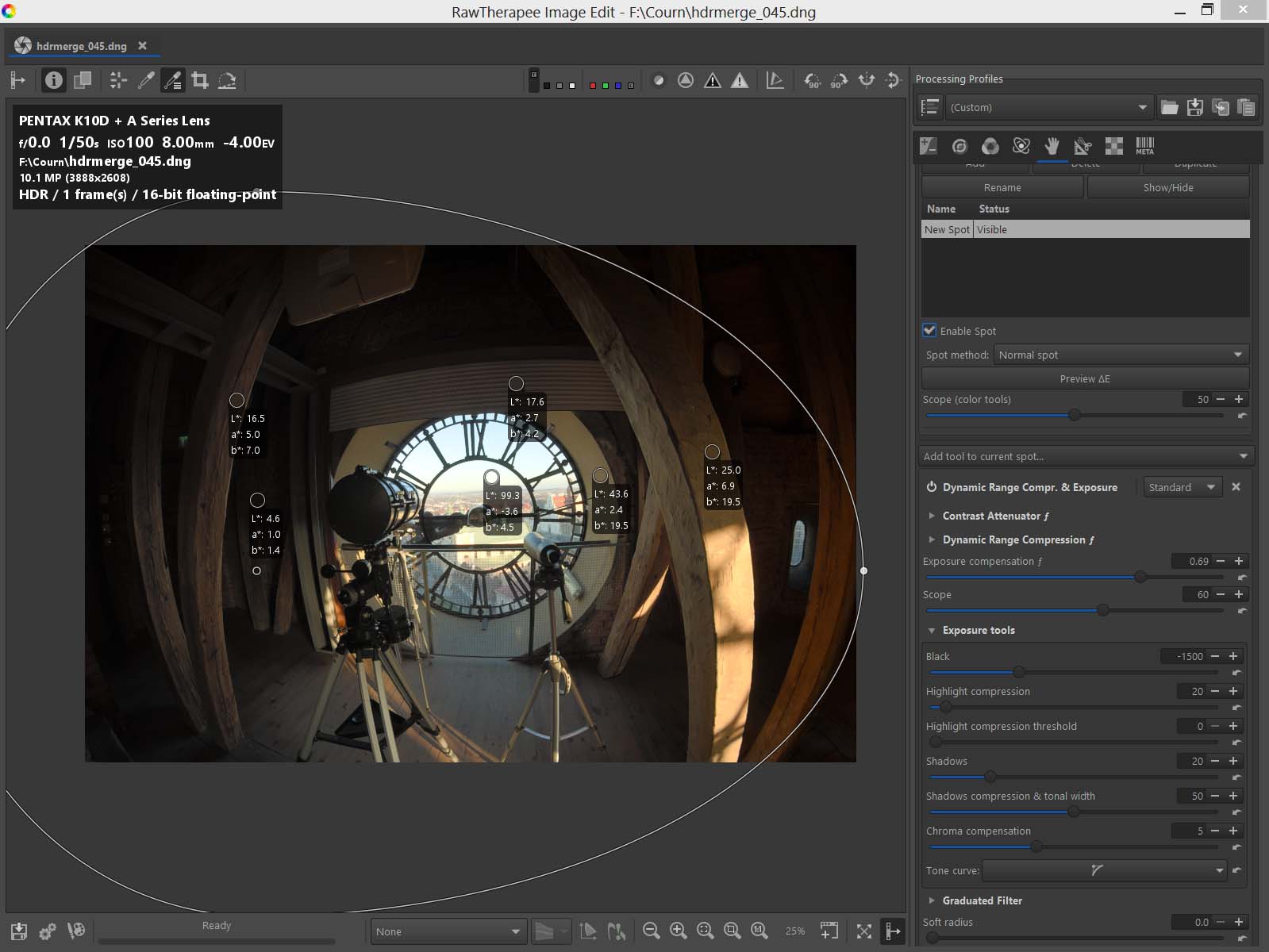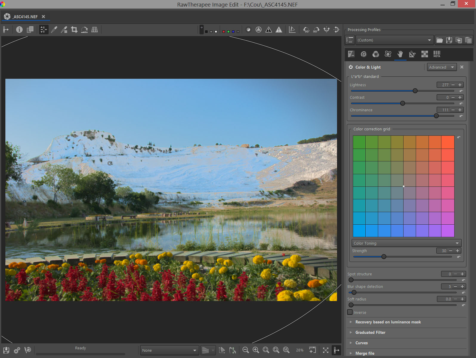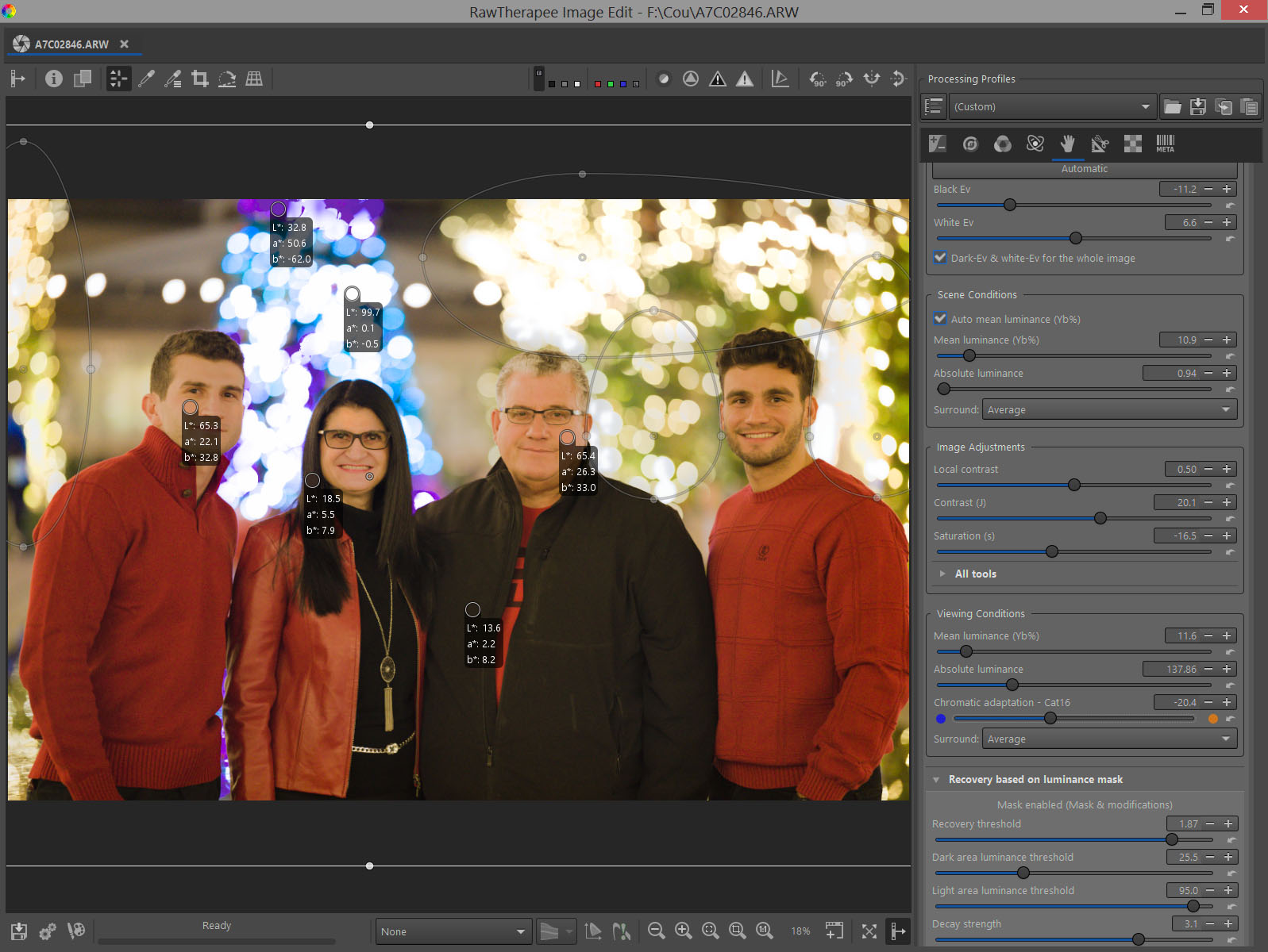 The extent to which these modifications are applied can be finely controlled allowing for very precise selections. Further refinement is possible with additional parametric masks but the shape-detection algorithms should be sufficient for the vast majority of local editing requirements. RT-spots can also be used in Excluding mode to prevent the algorithm from influencing certain parts of the image. The modifications that can be carried out are extensive and incorporate most of the functions available in RawTherapee’s global adjustment tools along with some additional tools available only in the Local Adjustments tab.