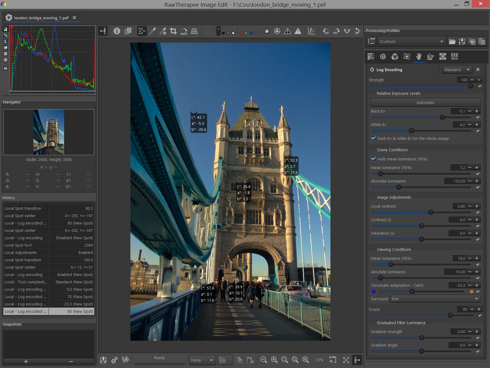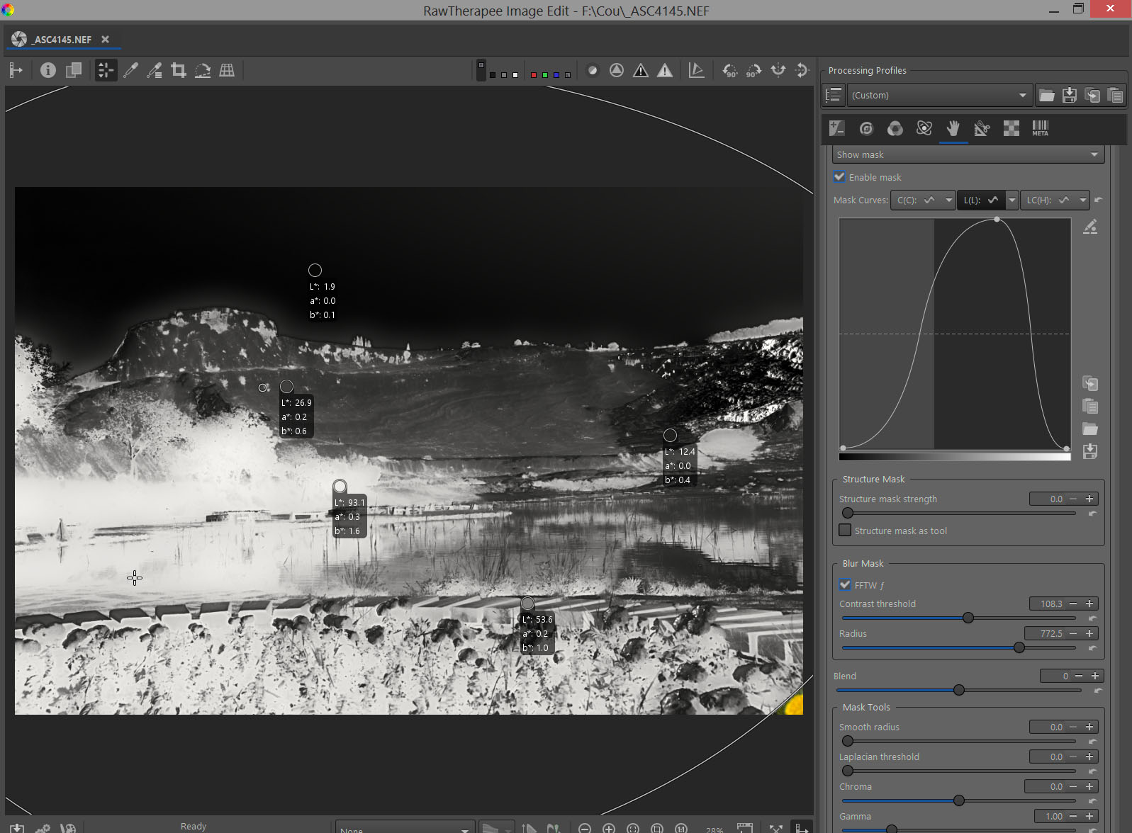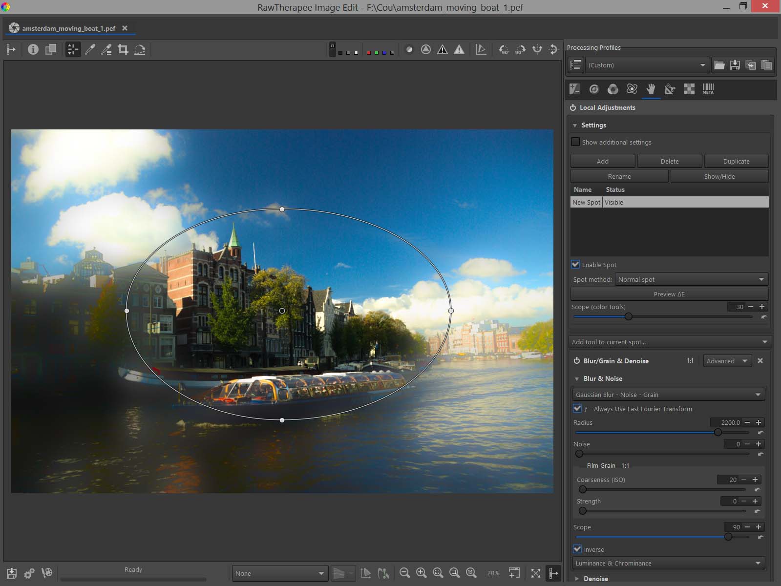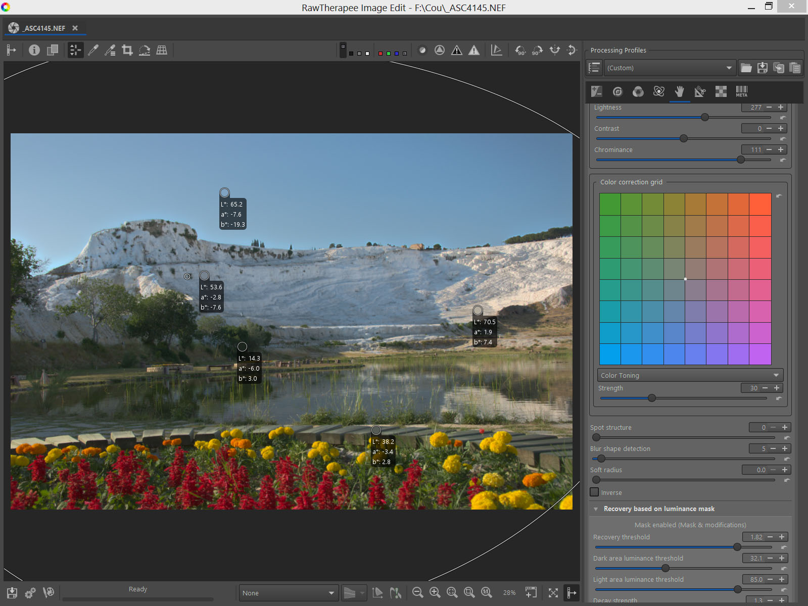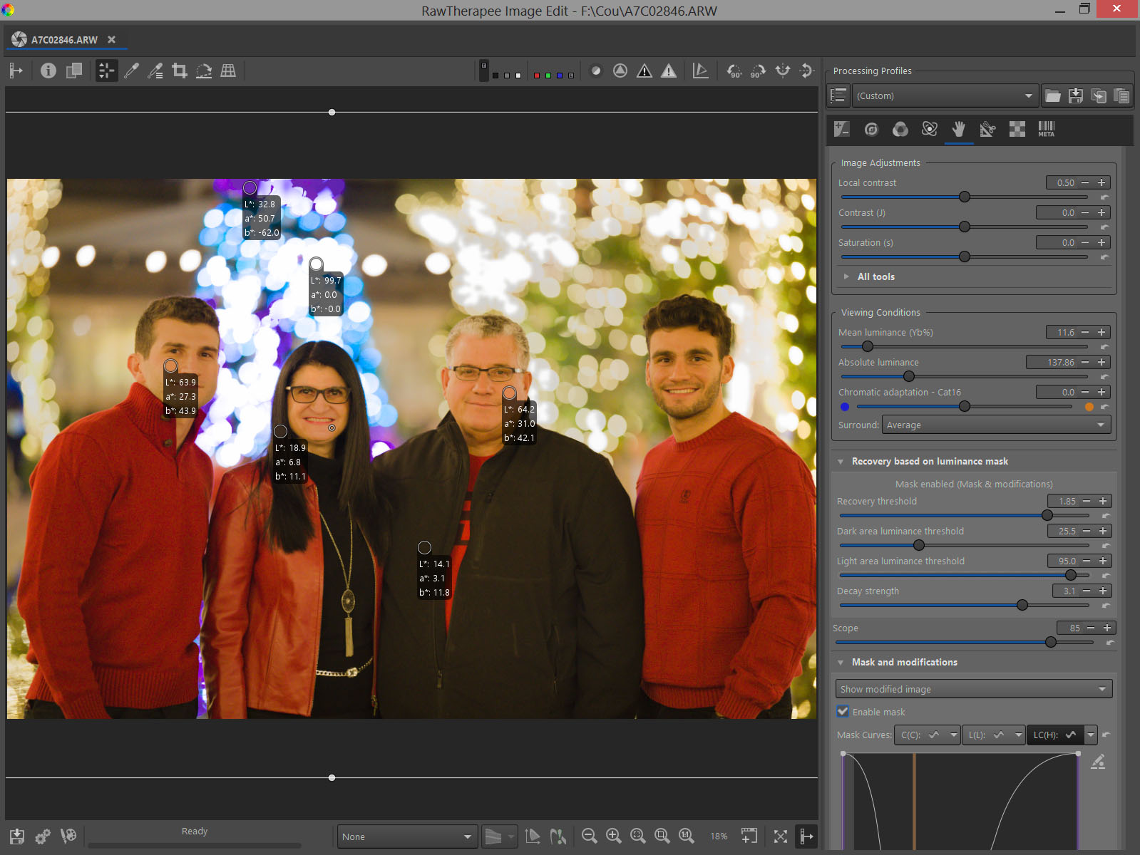 The extent to which these modifications are applied can be finely controlled allowing for very precise selections. Further refinement is possible with additional parametric masks but the shape-detection algorithms should be sufficient for the vast majority of local editing requirements. RT-spots can also be used in Excluding mode to prevent the algorithm from influencing certain parts of the image. The modifications that can be carried out are extensive and incorporate most of the functions available in RawTherapee’s global adjustment tools along with some additional tools available only in the Local Adjustments tab.