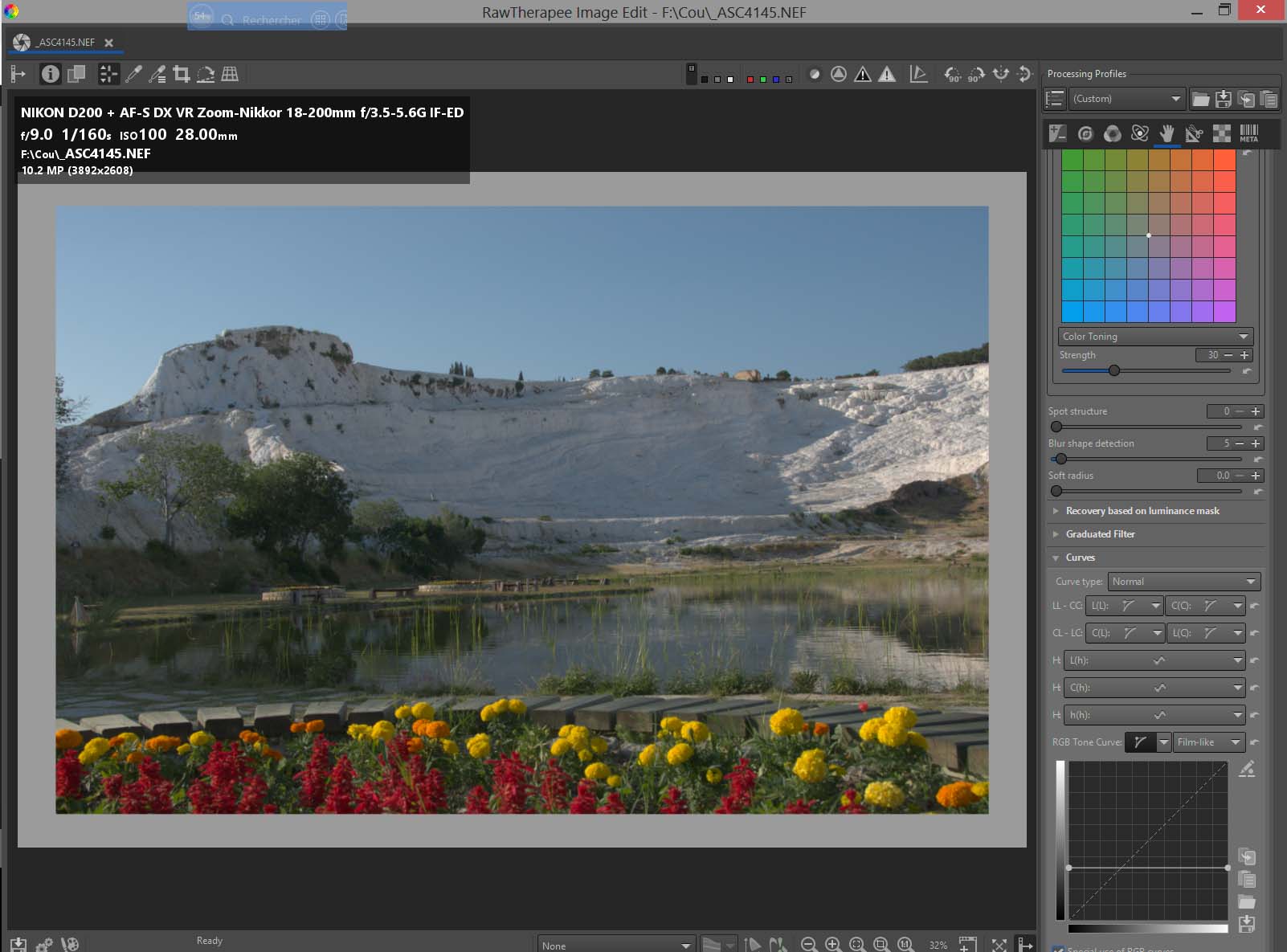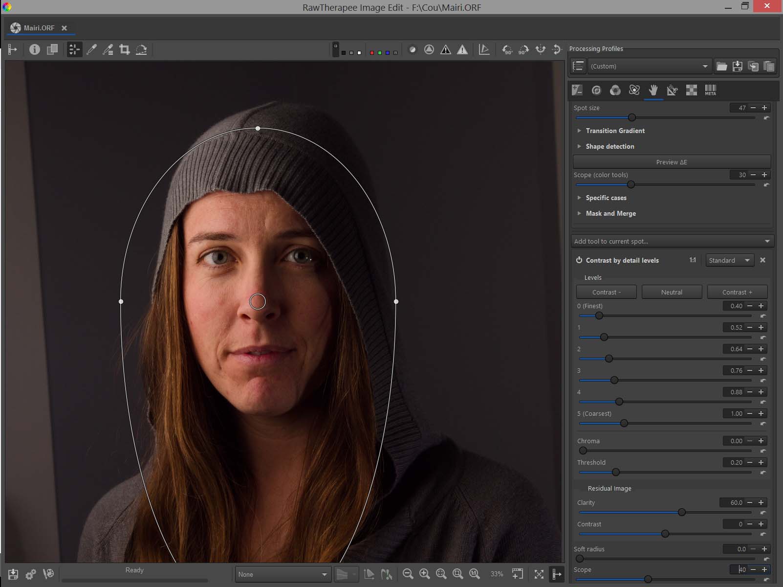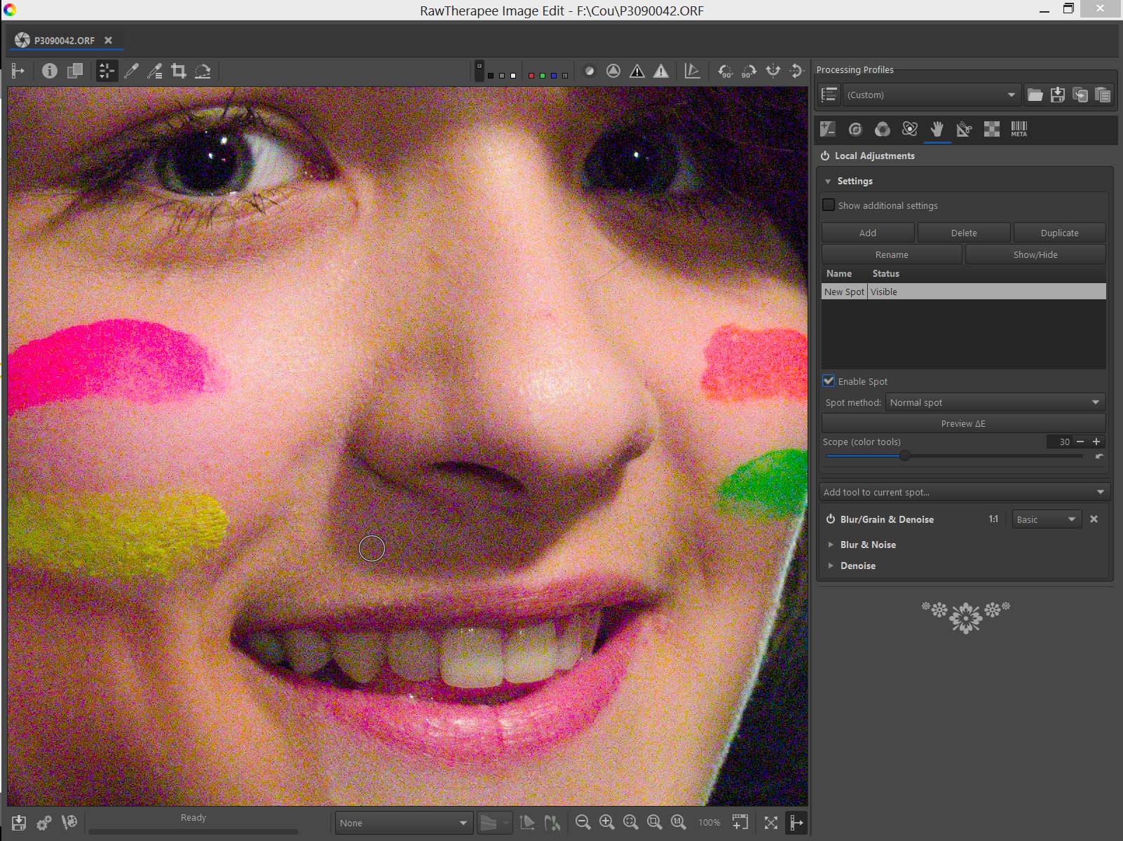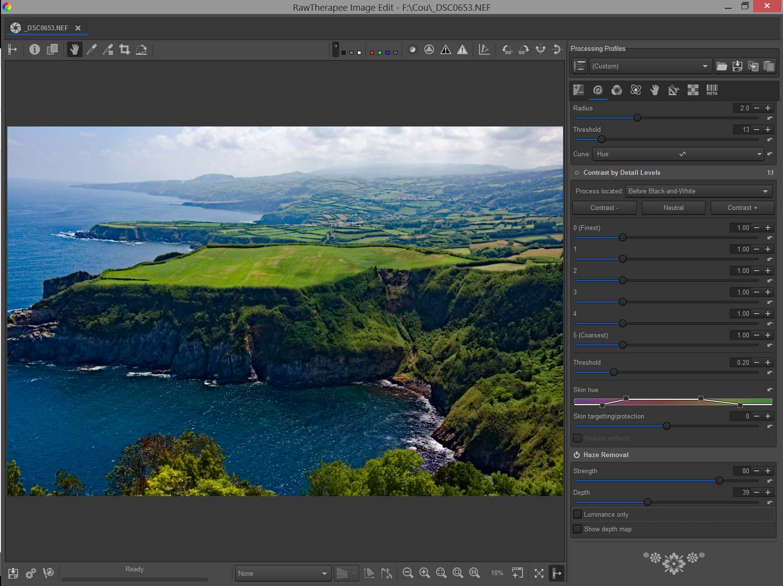The extent to which these modifications are applied can be finely controlled allowing for very precise selections. Further refinement is possible with additional parametric masks but the shape-detection algorithms should be sufficient for the vast majority of local editing requirements. RT-spots can also be used in Excluding mode to prevent the algorithm from influencing certain parts of the image. The modifications that can be carried out are extensive and incorporate most of the functions available in RawTherapee’s global adjustment tools along with some additional tools available only in the Local Adjustments tab.