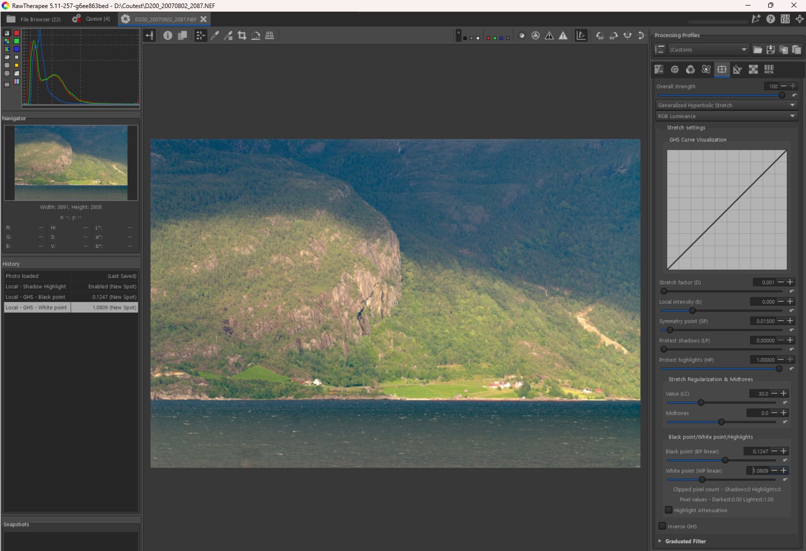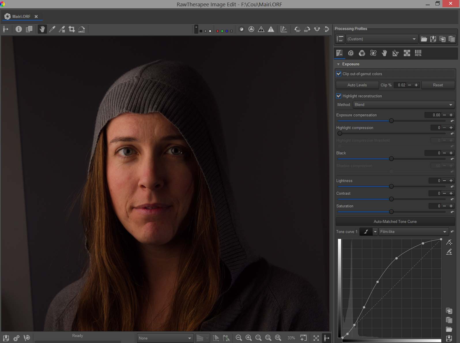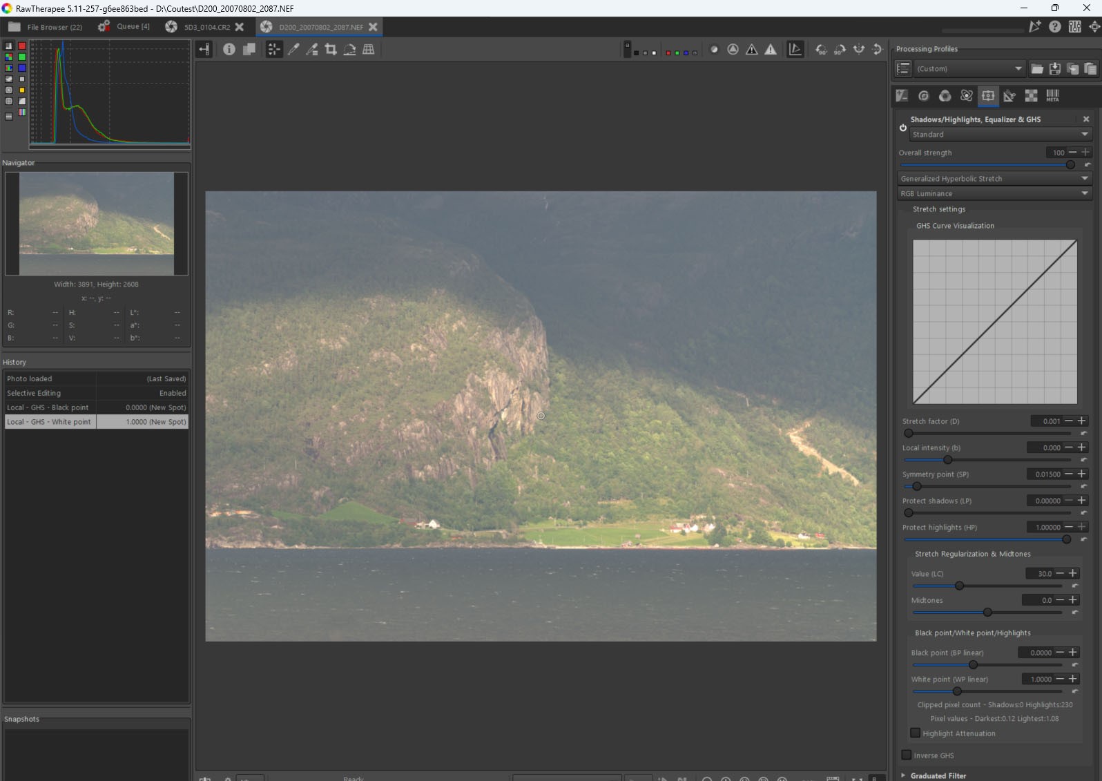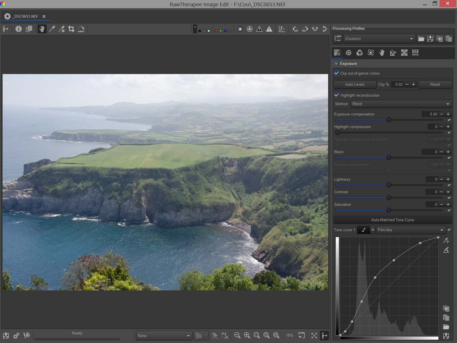 Adjust shadows & highlights with either the shadows/highlights sliders, a Tone Equalizer or a Tone Response Curve (TRC). Can be used instead of, or in conjunction with the Exposure module. Can also be used as a graduated filter.