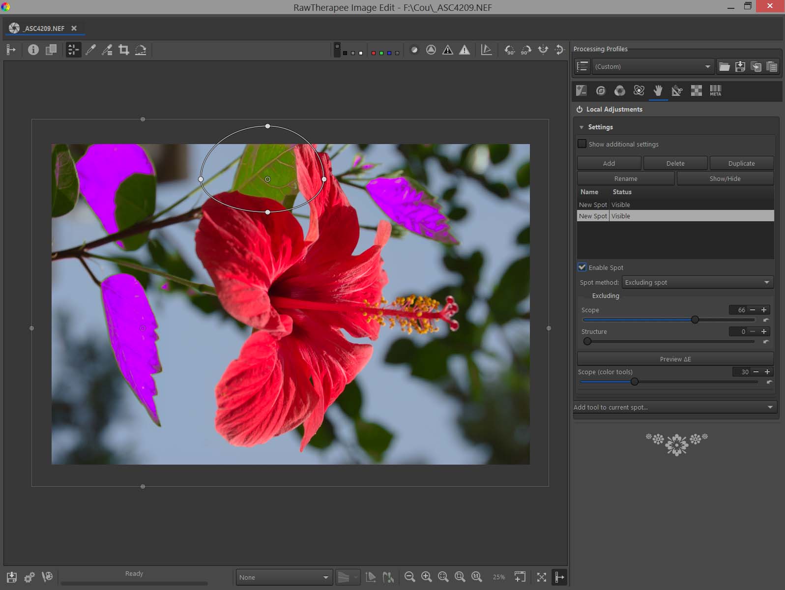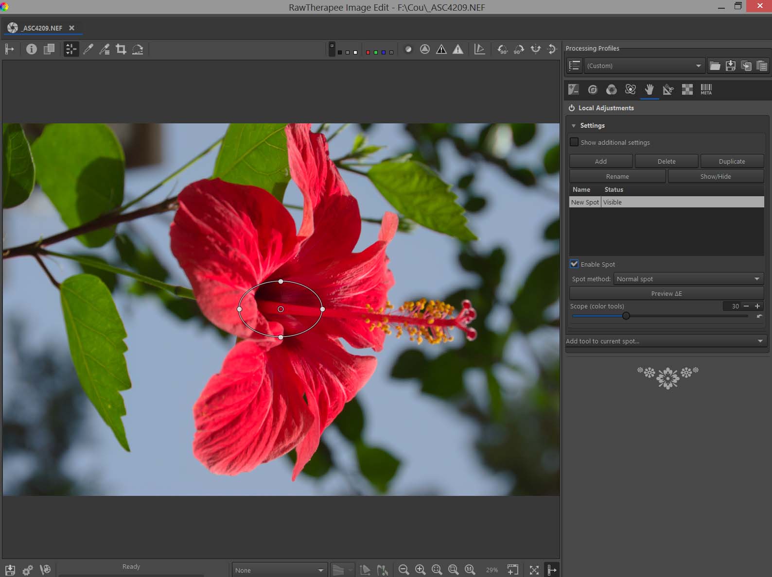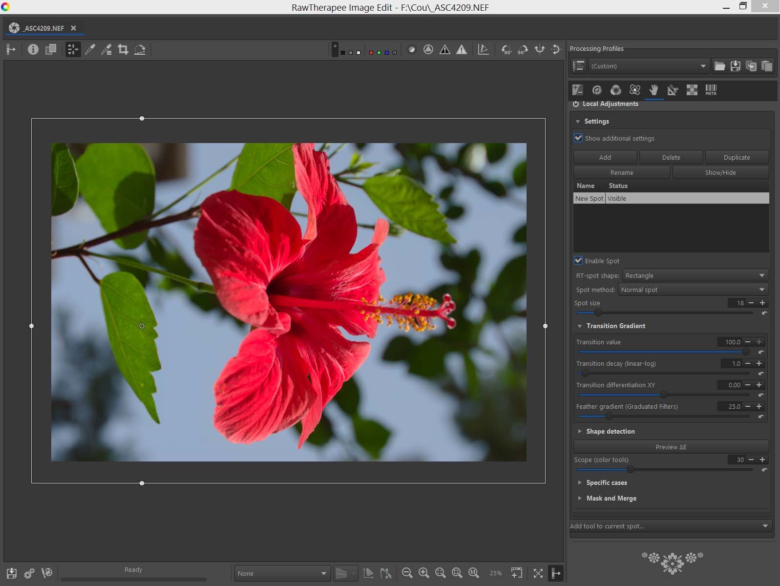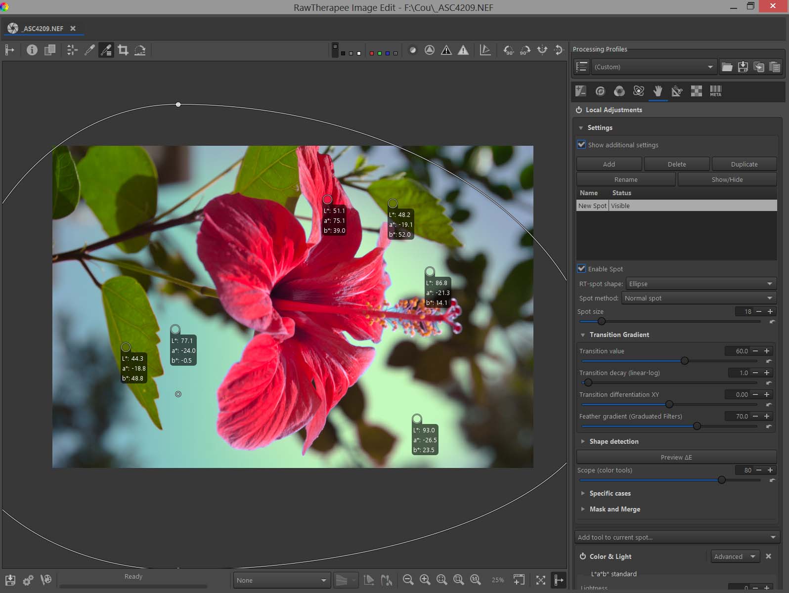 Position the RT-spot at the desired location. In this case, we want to increase the saturation of the red flower and reduce the luminance (lightness) without affecting the rest of the image.
