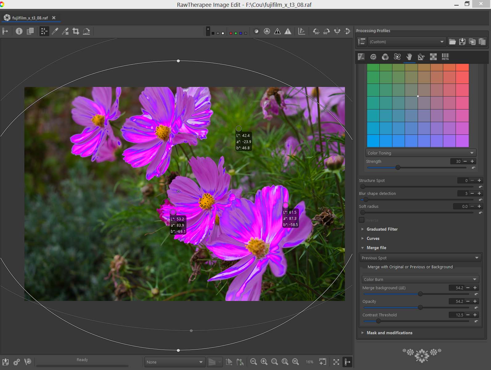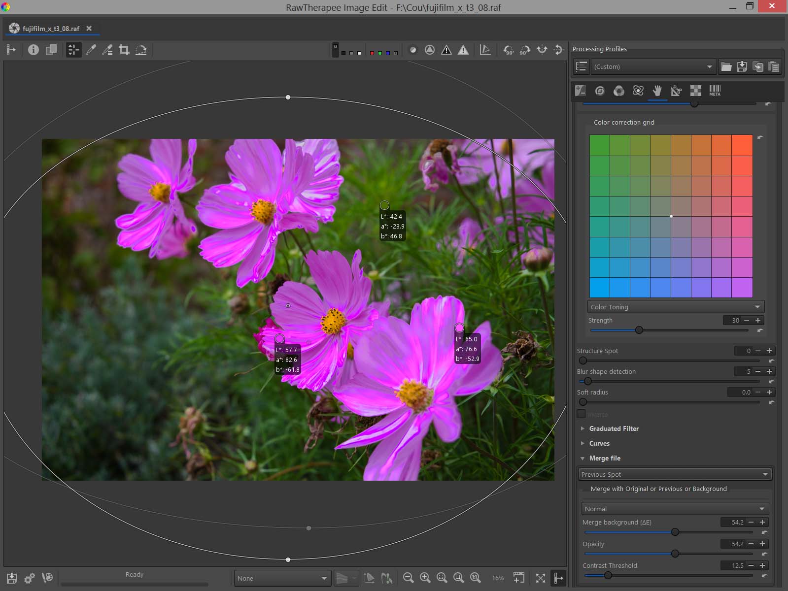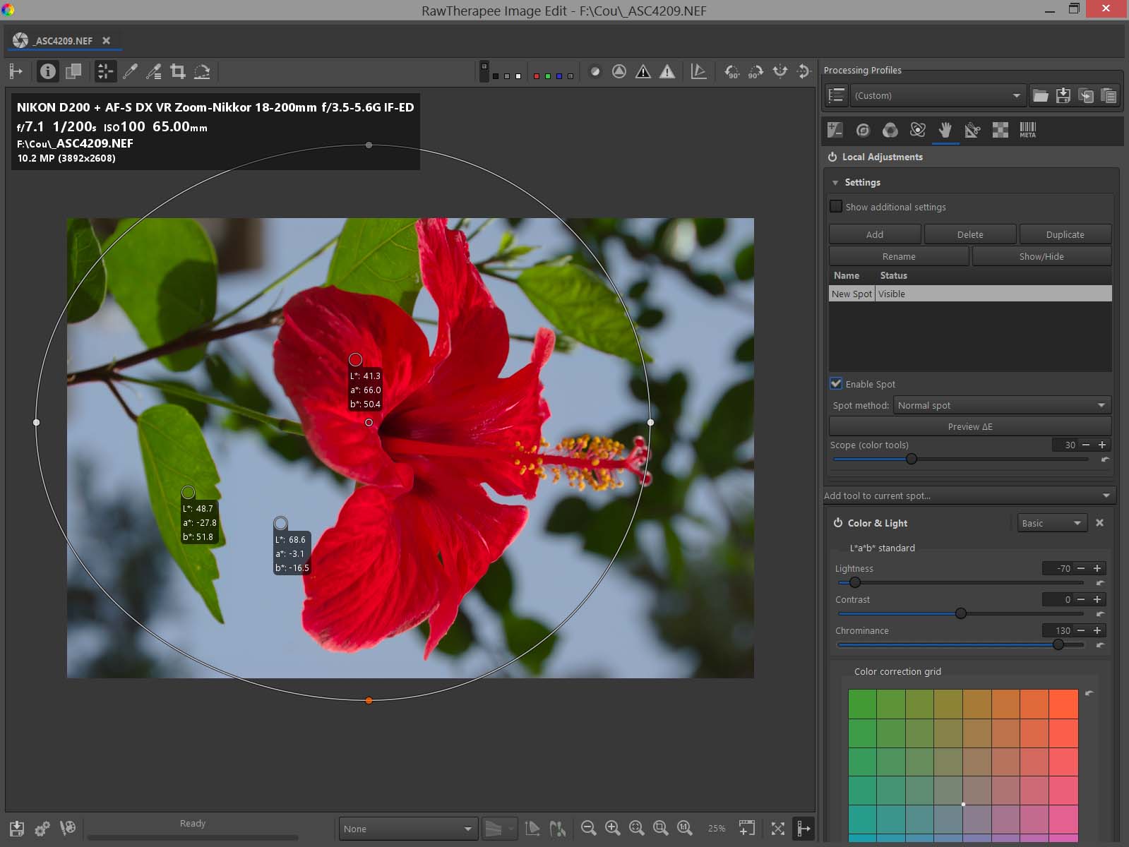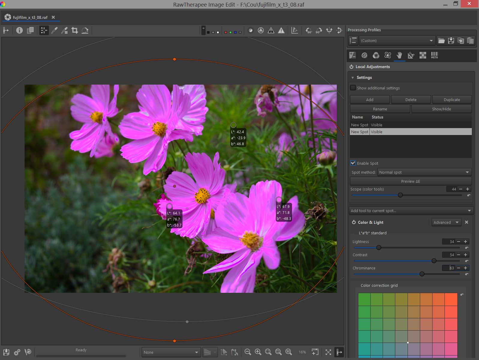 Position the RT-spot at the desired location. In this case, we want to increase the saturation of the red flower and reduce the luminance (lightness) without affecting the rest of the image.