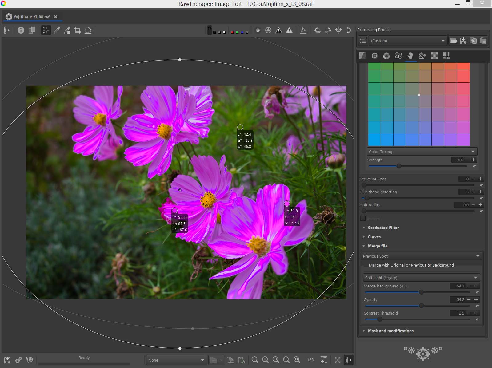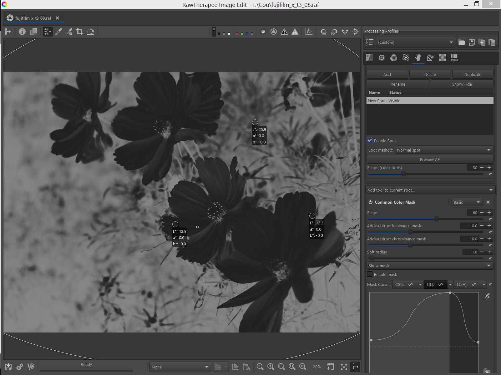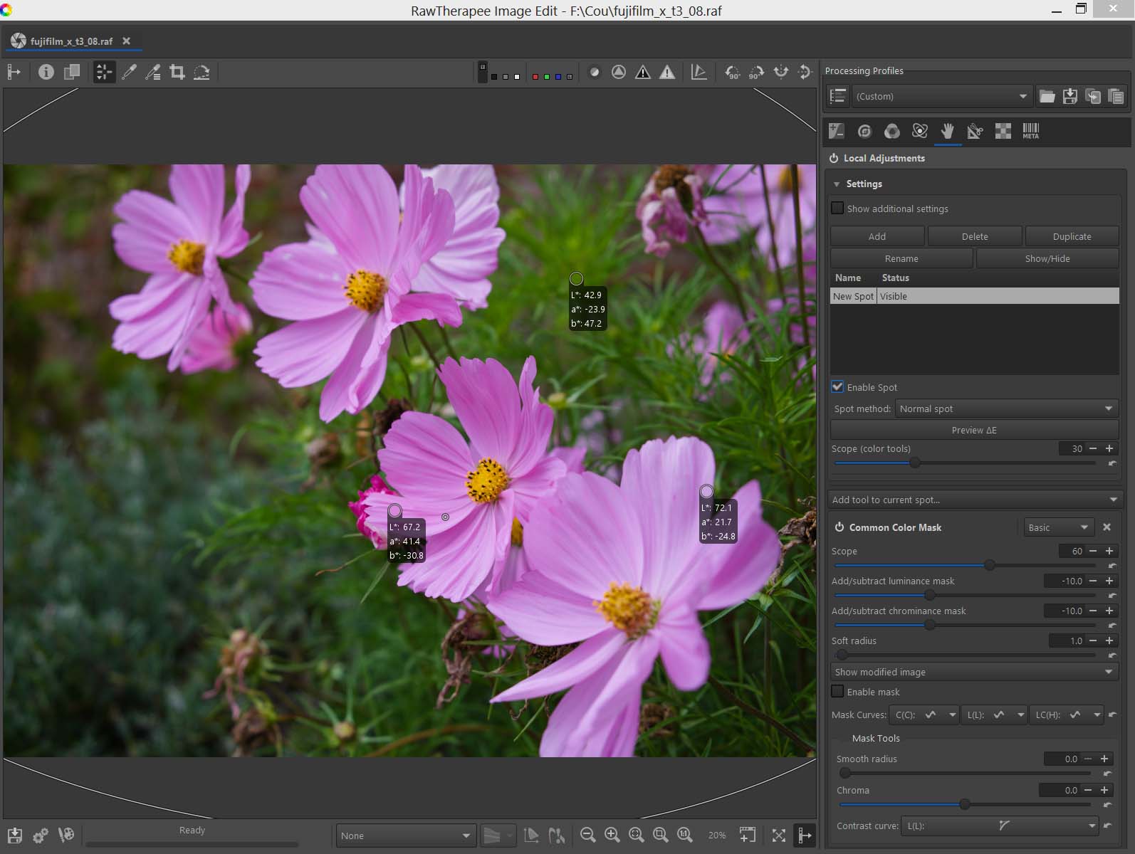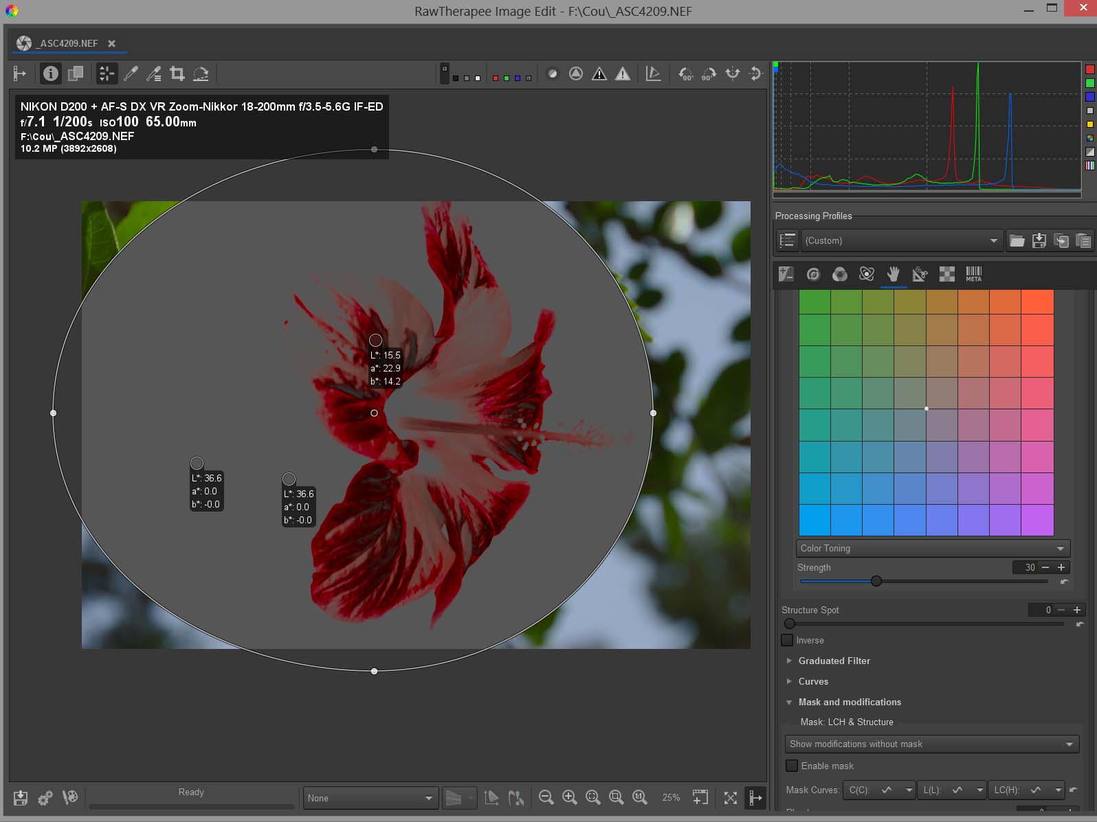 Position the RT-spot at the desired location. In this case, we want to increase the saturation of the red flower and reduce the luminance (lightness) without affecting the rest of the image.