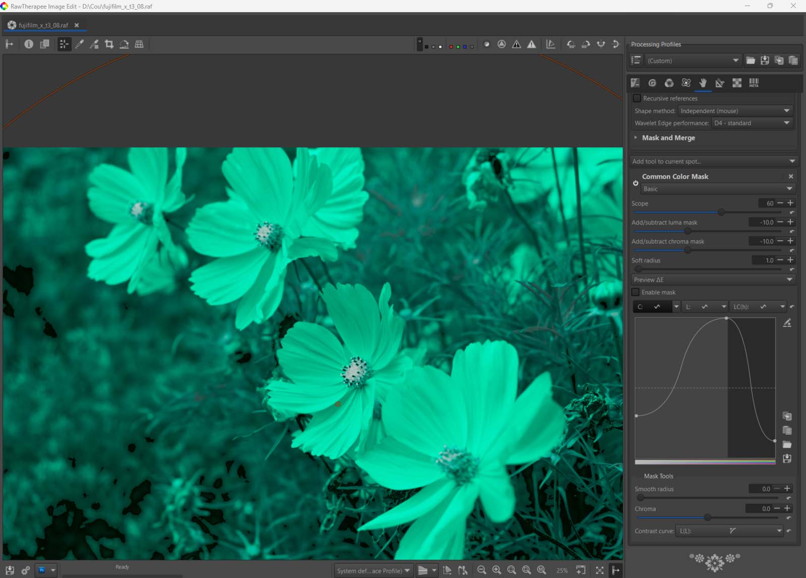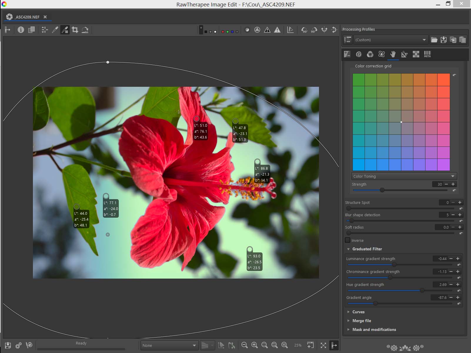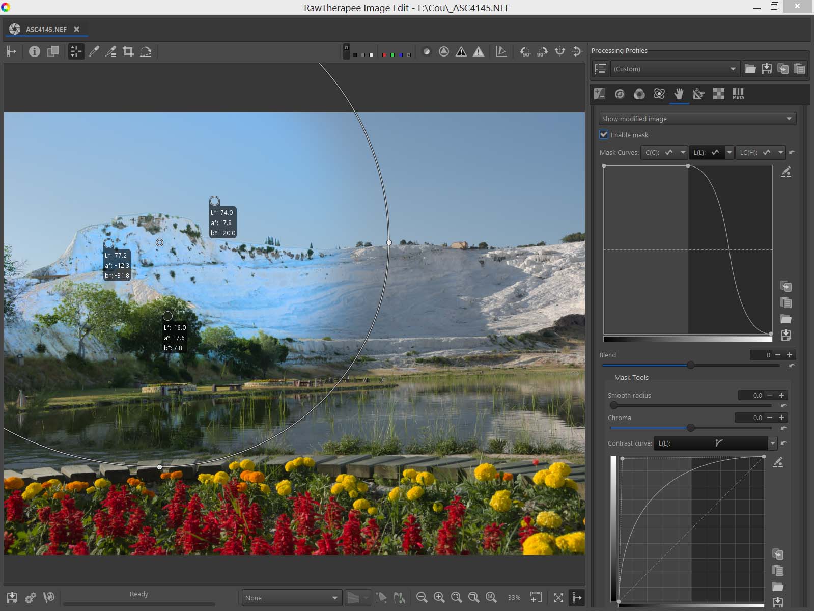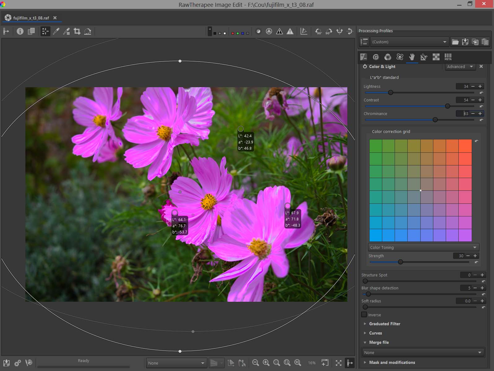 Position the RT-spot at the desired location. In this case, we want to increase the saturation of the red flower and reduce the luminance (lightness) without affecting the rest of the image.