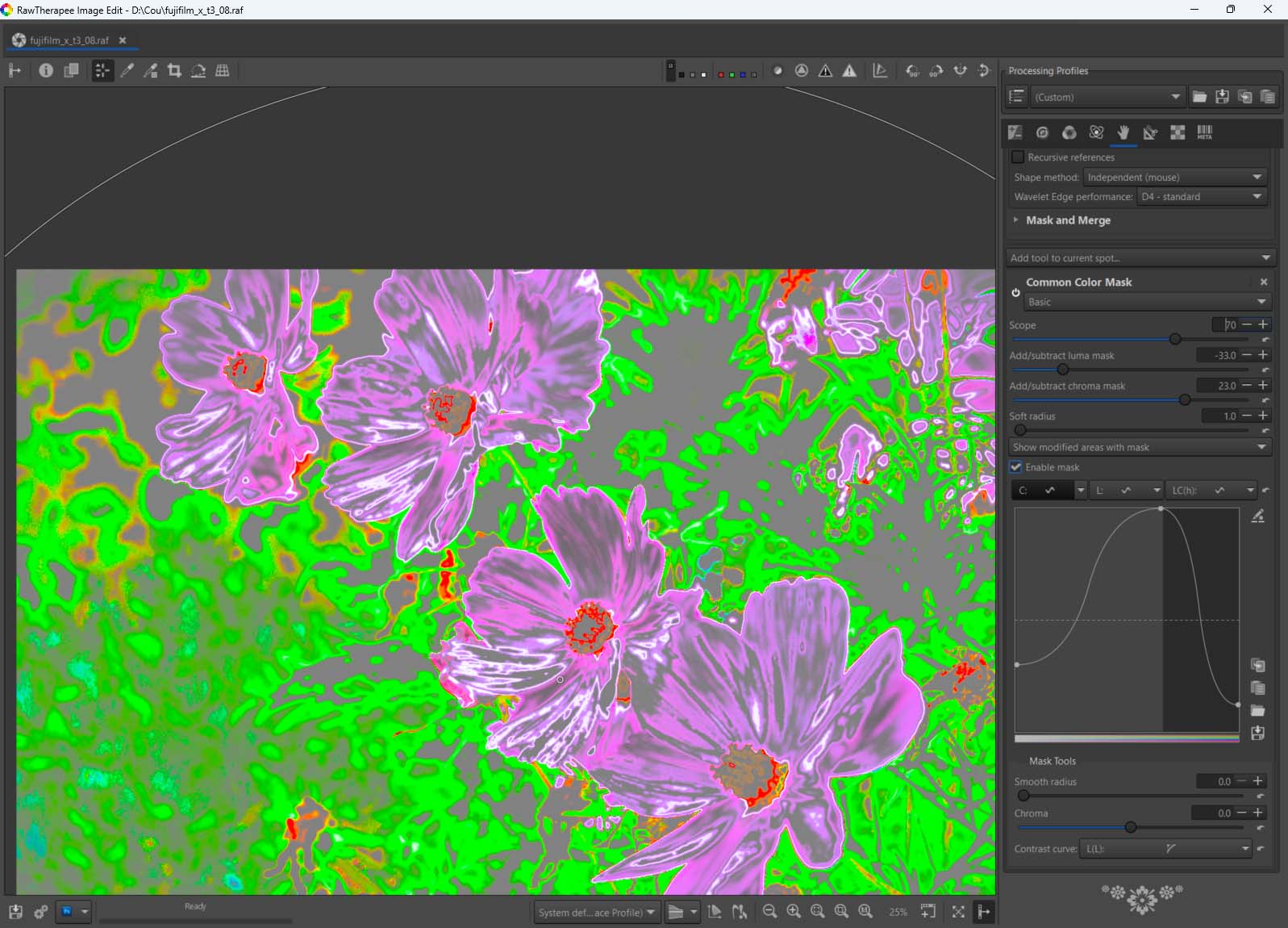 You can vary the intensity and color of this preview with “ΔE preview color " in the “Shape detection” section of the Settings module. The preview will also let you see the effect of varying the other sliders in the “Shape detection” section.