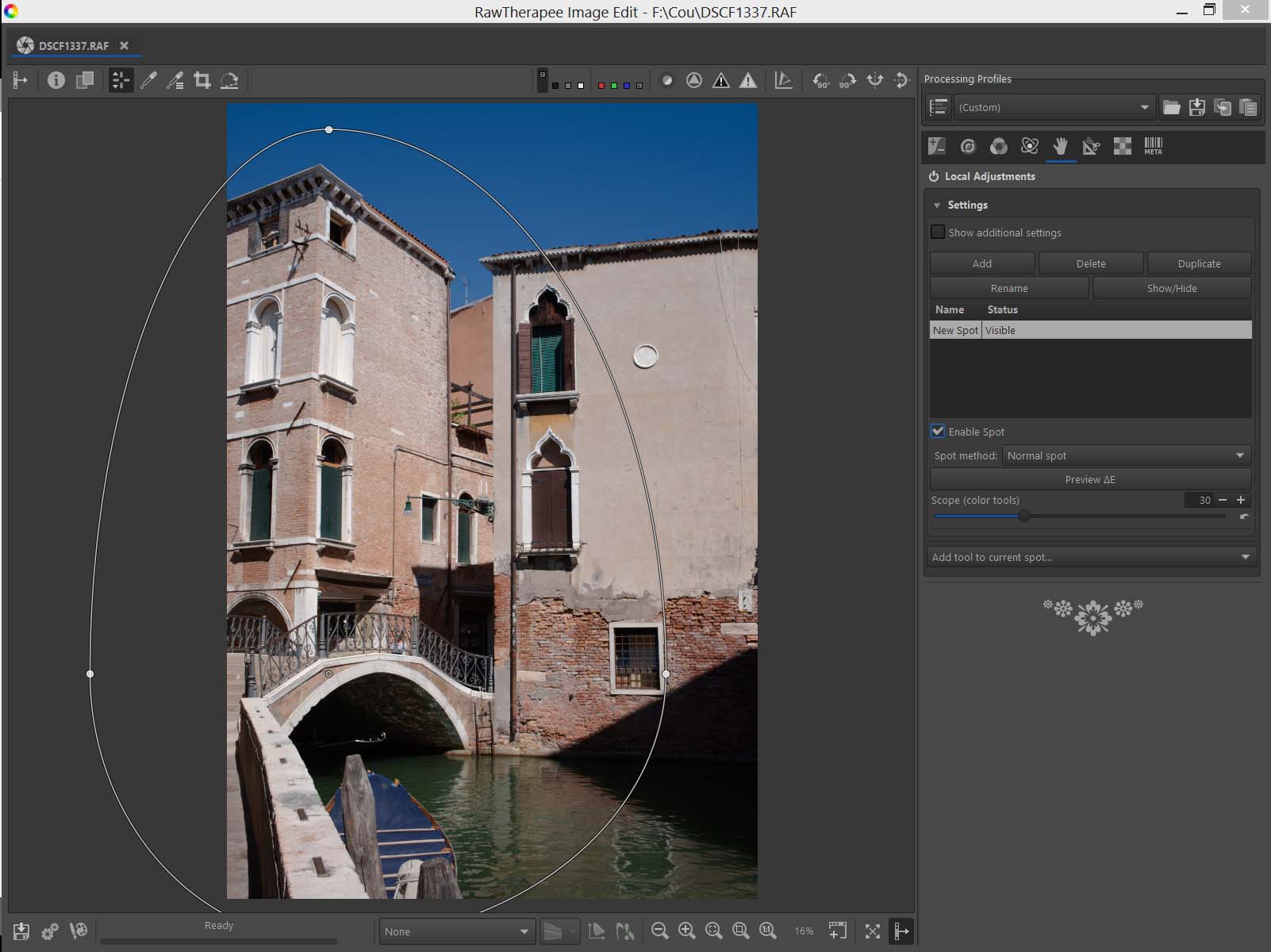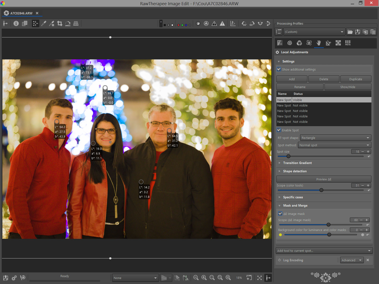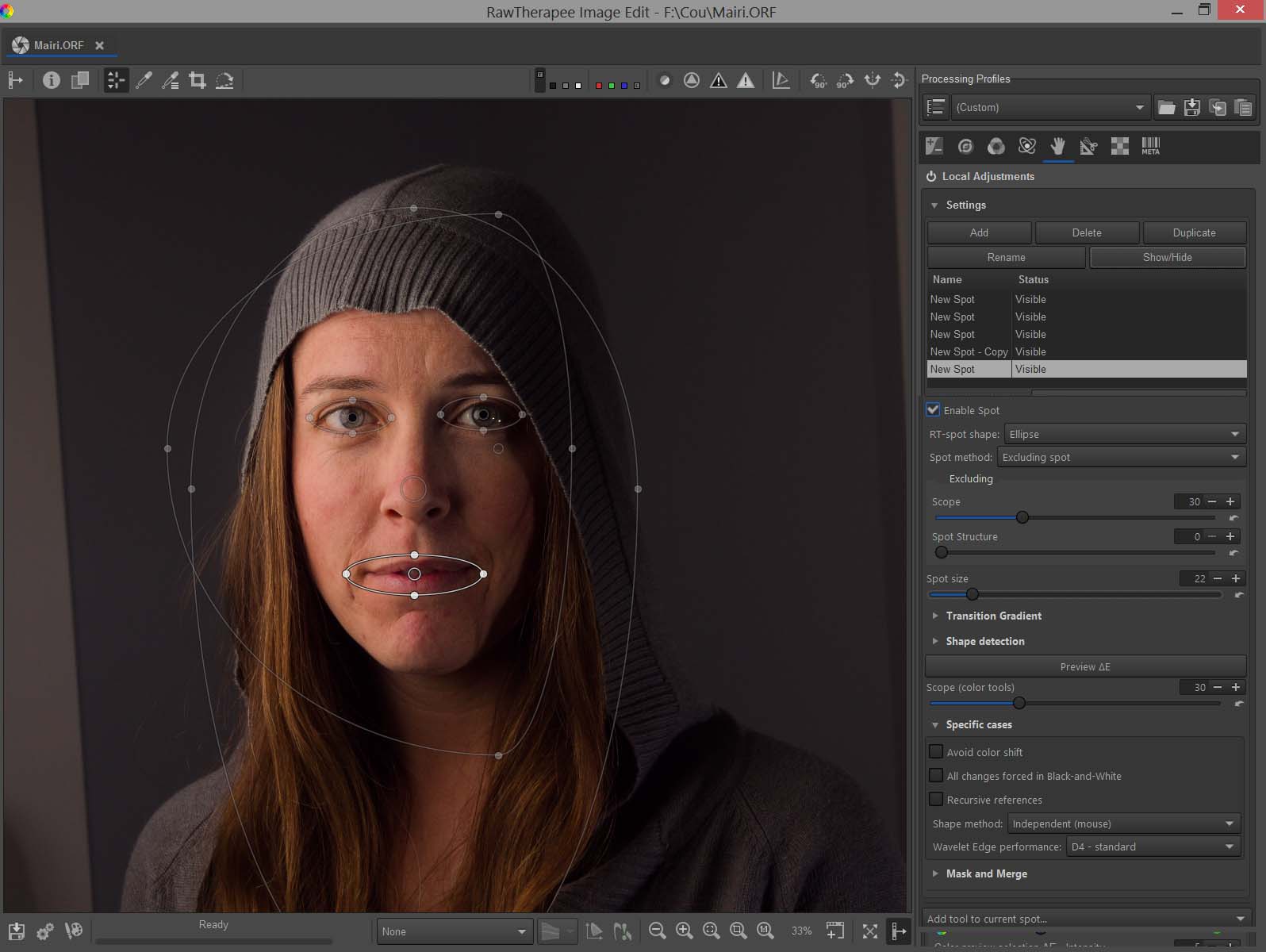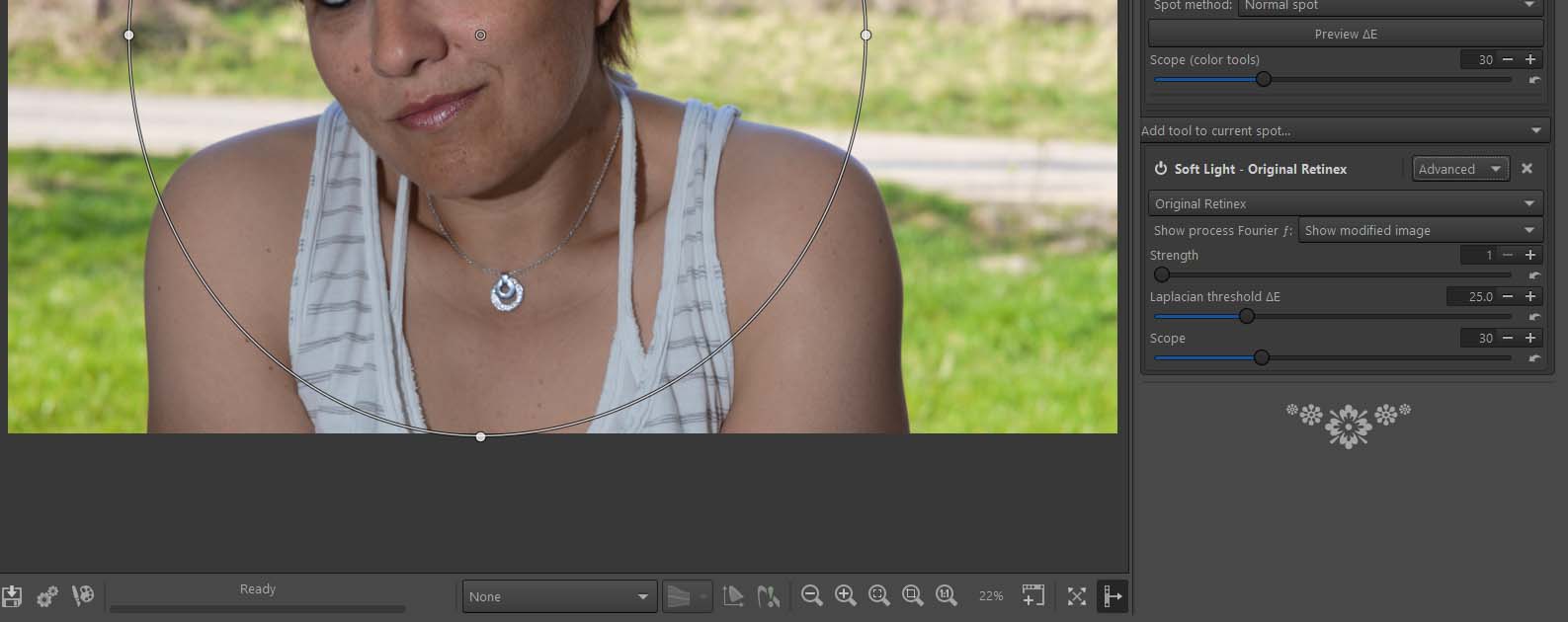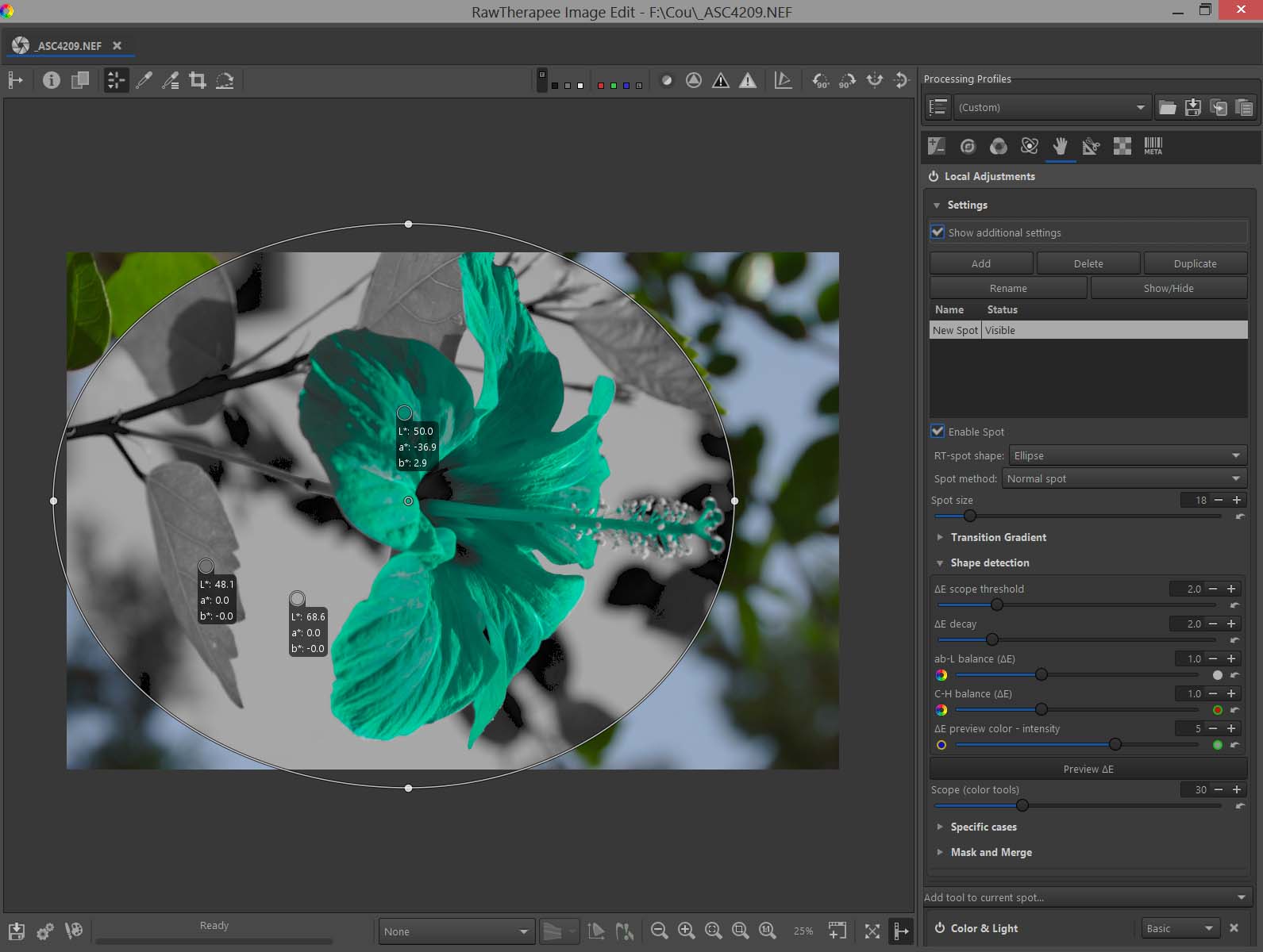 Local editing (Selective Editing) in RawTherapee is based on RT-spots, which are similar in principle to the U-Point concept originally used in Nikon Capture NX2 and subsequently in the Nik Collection, DxO PhotoLab and Capture NXD. RT-spots use algorithms developed specifically for RawTherapee by Jacques Desmis. This approach is completely different to the more familiar local editing methods used in applications such as GIMP, Photoshop, etc., which primarily use selection tools such as lassos, magic wands etc., associated with brushes, layers and blend masks. These methods can be time consuming and difficult to use accurately when complex shapes are involved. An RT-spot consists of either an ellipse or a rectangle with a variable-diameter circle at the center. The shapes have four control points, which can be adjusted independently or symmetrically. The rectangle spot can also be used in full-image mode which automatically sets the control points outside the image preview area. Future developments will provide enhanced shape manipulation.