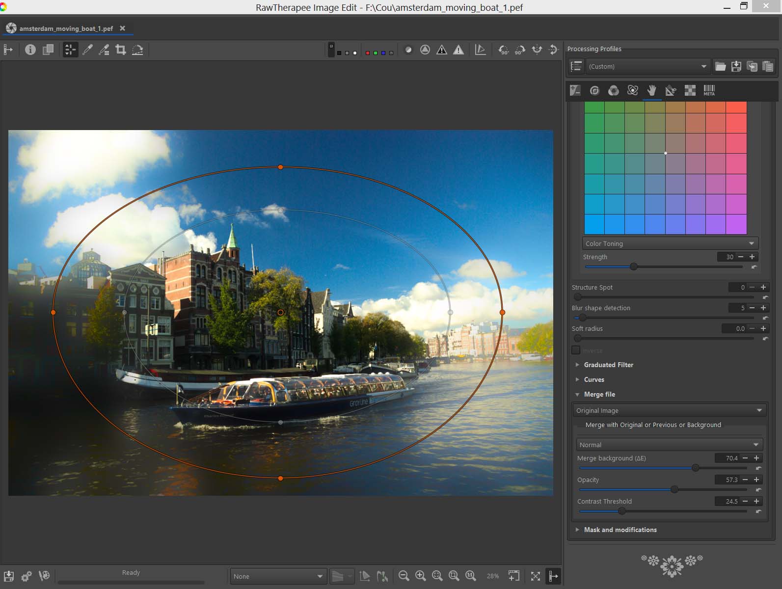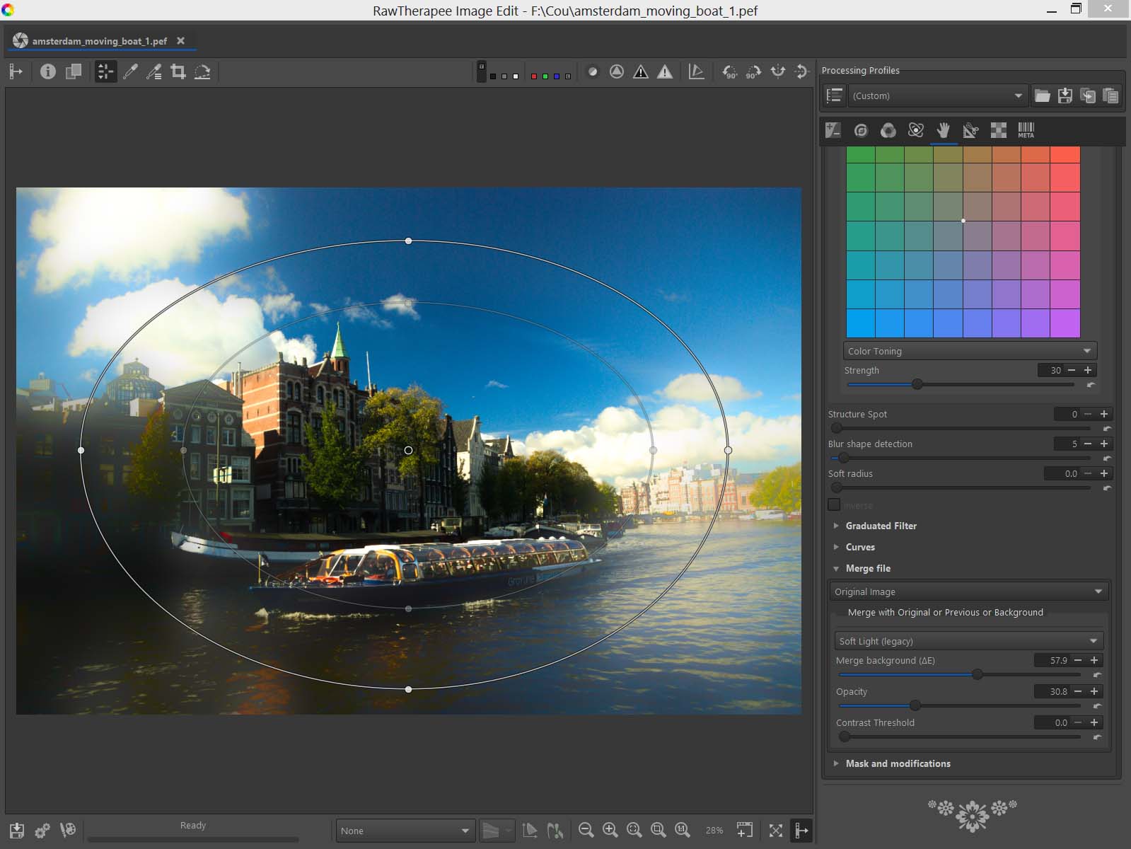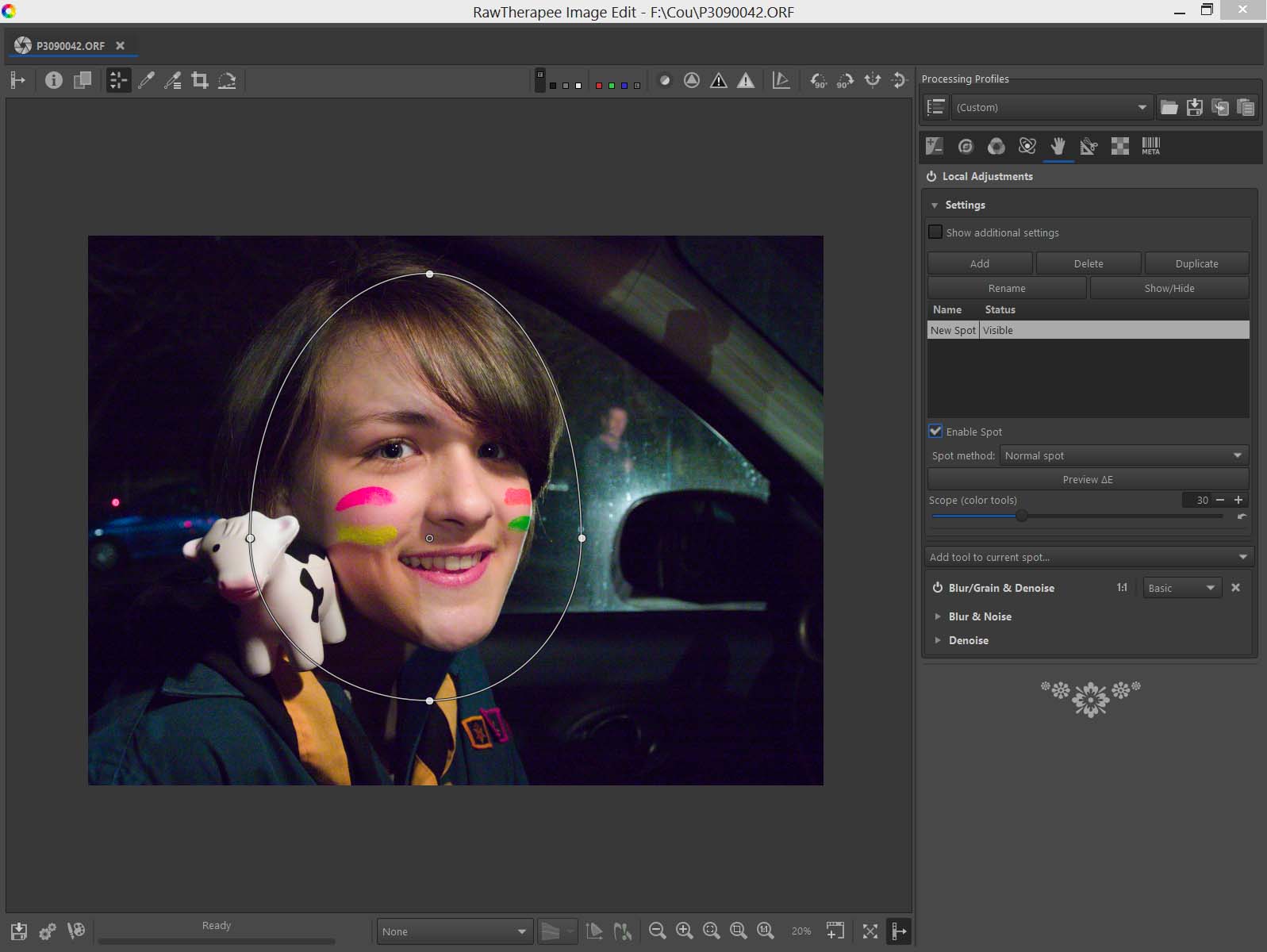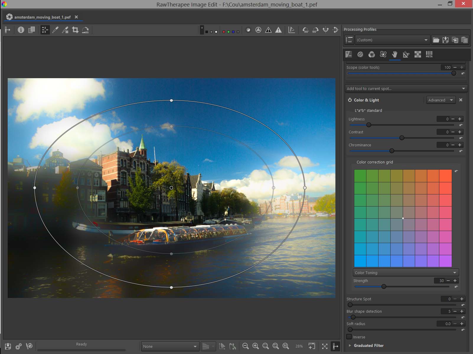 Local editing (Selective Editing) in RawTherapee is based on RT-spots, which are similar in principle to the U-Point concept originally used in Nikon Capture NX2 and subsequently in the Nik Collection, DxO PhotoLab and Capture NXD. RT-spots use algorithms developed specifically for RawTherapee by Jacques Desmis. This approach is completely different to the more familiar local editing methods used in applications such as GIMP, Photoshop, etc., which primarily use selection tools such as lassos, magic wands etc., associated with brushes, layers and blend masks. These methods can be time consuming and difficult to use accurately when complex shapes are involved. An RT-spot consists of either an ellipse or a rectangle with a variable-diameter circle at the center. The shapes have four control points, which can be adjusted independently or symmetrically. The rectangle spot can also be used in full-image mode which automatically sets the control points outside the image preview area. Future developments will provide enhanced shape manipulation.