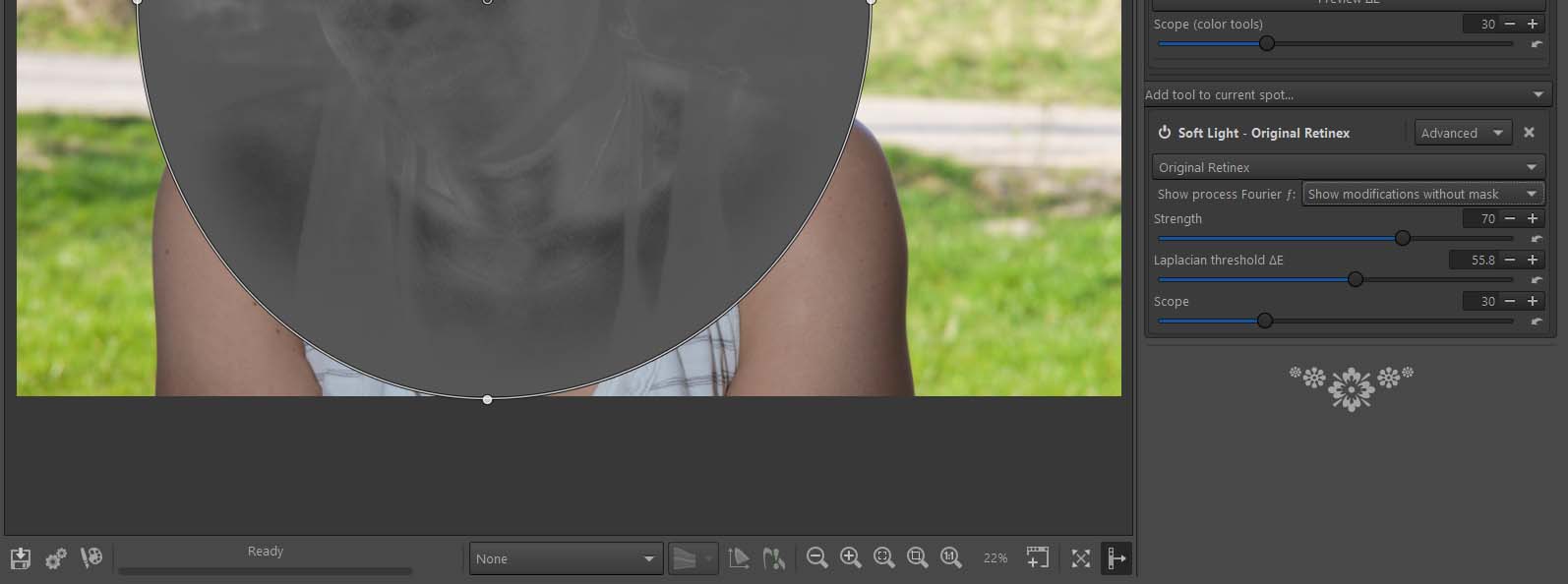 The RT-spot algorithm uses shape detection based on ΔE (the change in the visual perception of two given colors) to select the parts of the image to be modified inside the ellipse or rectangle. The reference values used for the shape detection algorithm are based on the average of the hue, chroma and luminance values inside the variable-diameter circle. This means that in full-image mode (and also in Normal or Excluding modes) these values and the subsequent shape detection can vary depending on the position of the circle.