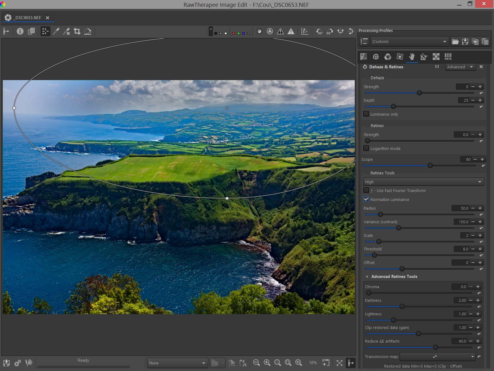 Dehaze and Retinex (Advanced mode only). Useful for dehaze, local contrast with high values and simulation of “clarity”.