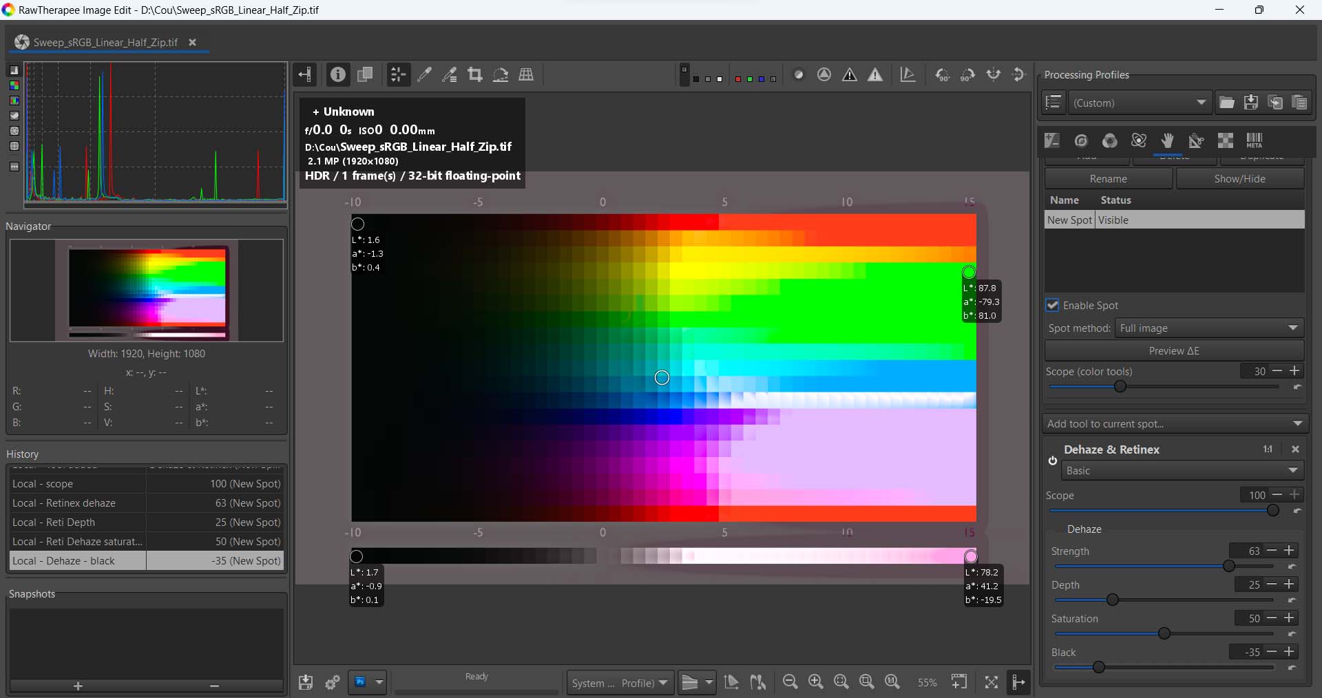 Note: provided the checkbox “Avoid color shift” in the Settings module has not been disabled, the following operations will be carried out on the data before and after any RT Spot is activated.