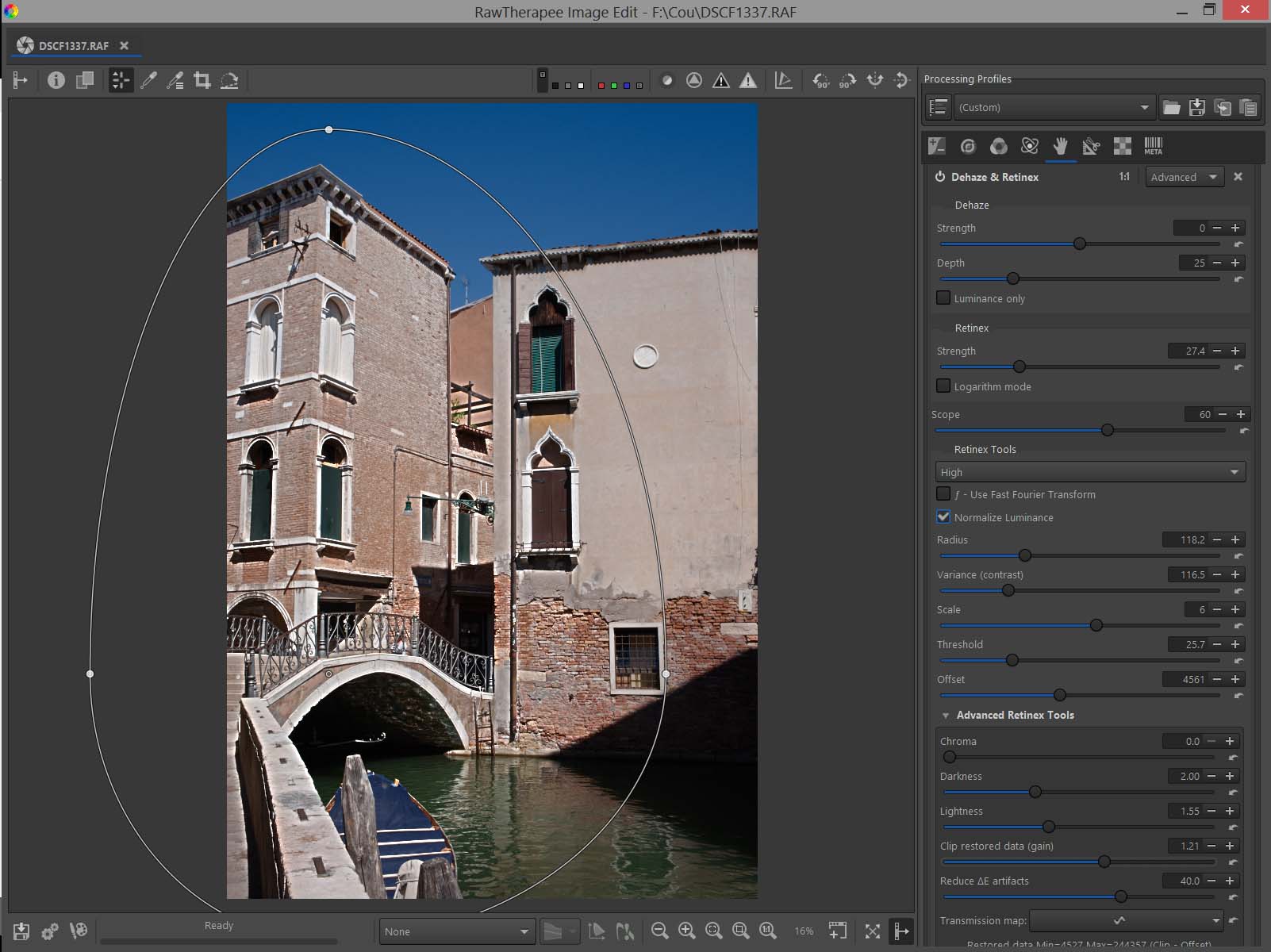 - The algorithm takes into account the size of the RT-spot and if necessary will detect any high contrast or dark areas. If you choose a full-image RT-spot and set the Scope to 100, you will obtain similar results to those obtained with ART.