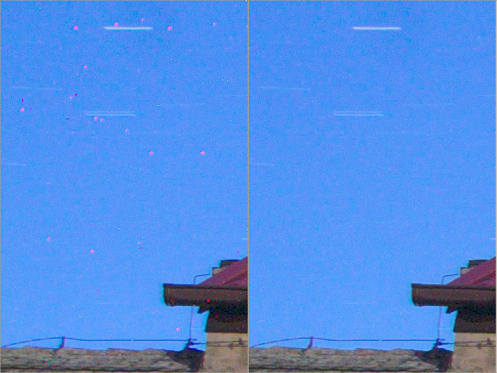 “Dead pixels” on the other hand appear as black dots (or crosses or blobs). They are the result of dead photosites on the sensor, and as such, exposure time does not have any influence on whether they appear or not - if a photosite is dead, every photo will have the dead pixel in the same spot. Because their position is static and always present when using the same camera body, you can fix them not only using the automatic “Dead pixel filter” but also by adding their coordinates to a .badpixels file; see Bad Pixels.