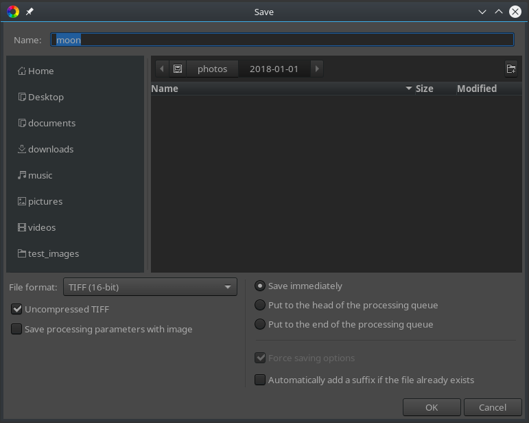 Using the “Save immediately” feature will put your CPU immediately to work, and as a result, opening and tweaking other images in the Editor will be somewhat slow while the image is being saved. The queue mechanism allows you to put edited images which are ready to be saved to a virtual queue which you can start processing at a later time. Adding them to the queue is instant, so you can continue editing other images and making the most of your CPU for editing. Once you are done editing and putting images to the queue, you can flip the large “On” switch and go off to brew yourself a coffee while RawTherapee grinds away at all the images in the queue.