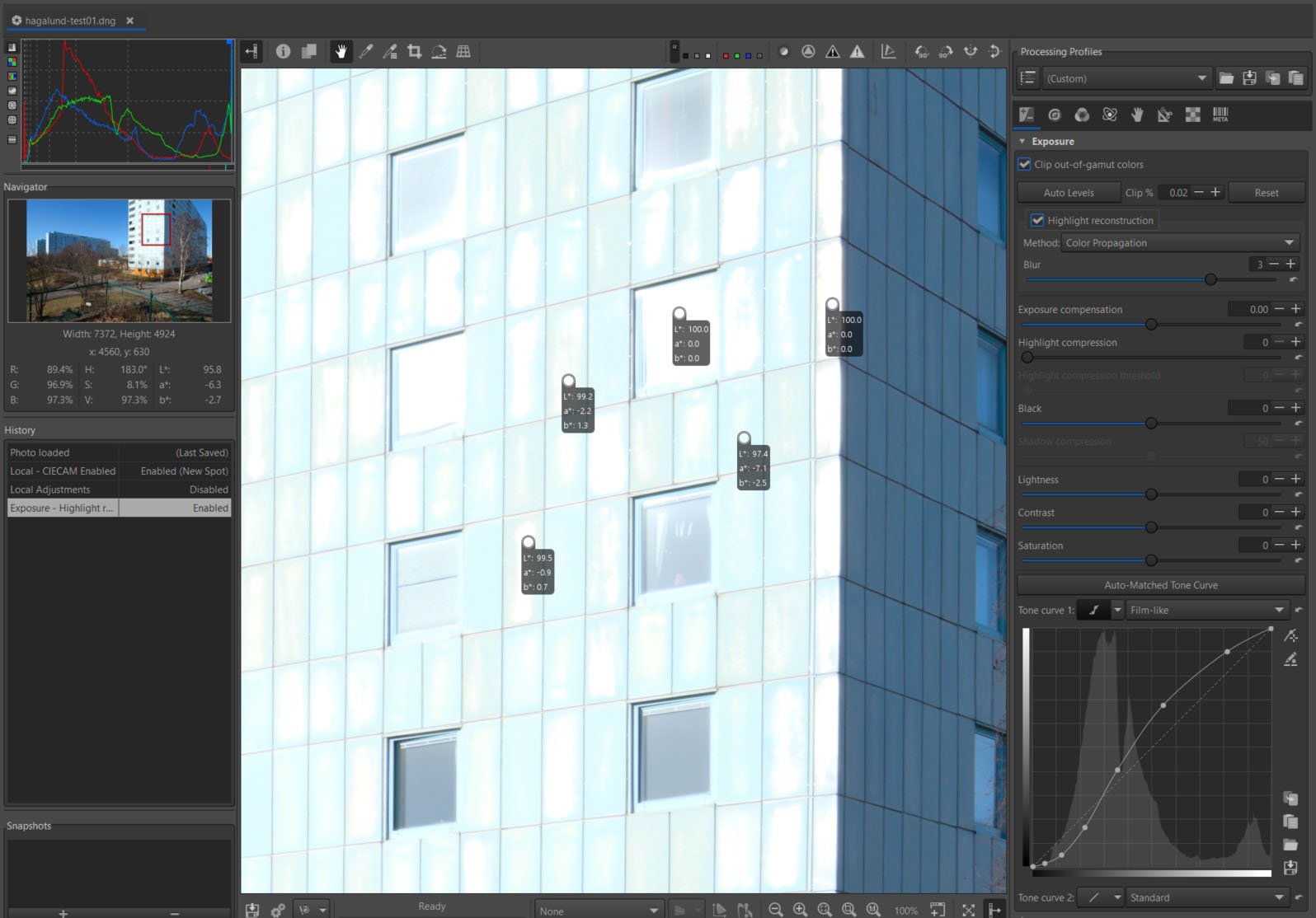 - Lab process: Shadows/highlight, Lab adjustments, Graduated filter, Tone-mapping, etc. ;