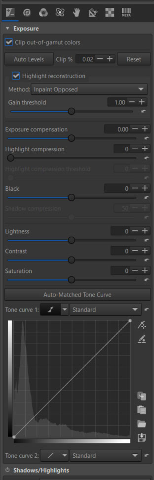 - You may or may not activate ‘Auto-matched Tone-Curve’, and select a Curve mode other than ‘Film like’