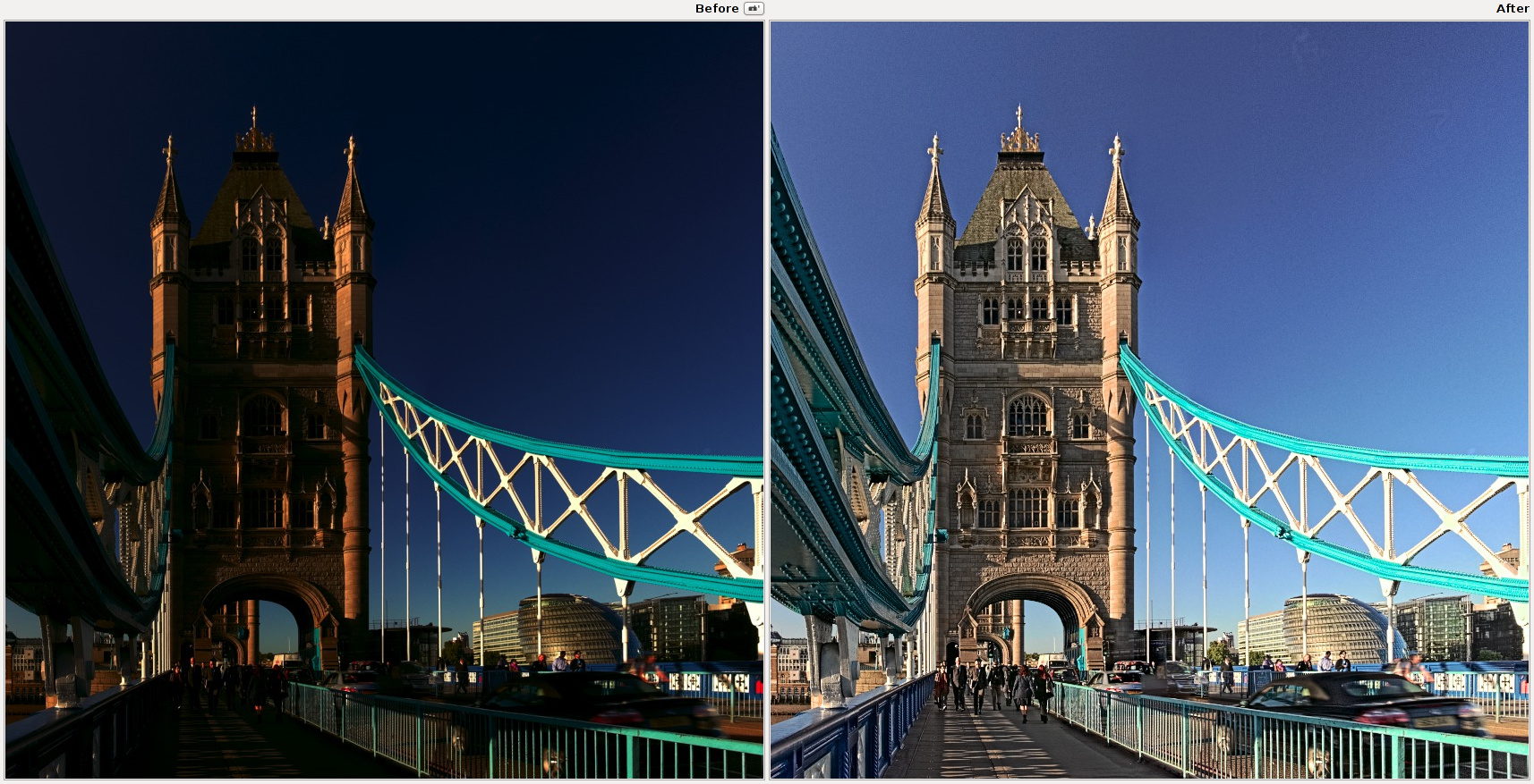 In some cases tone mapping may result in a cartoonish appearance, and in some rare cases soft but wide halos may appear. Increasing the number of reweighting iterates will help fight some of these problems. When more than zero reweighting iterates are used, the best results will be had if the edge stopping parameter is set to one (technical detail: this results in a 1-norm approximation of the smoothness using iteratively reweighted least squares). Artifacts in high contrast edges may begin to appear when this value is set to about 1.8 or higher.