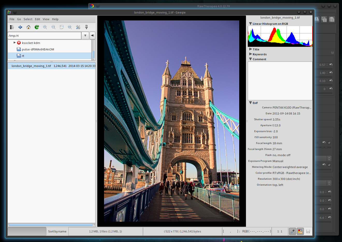 The default values for this tool are Edge Stopping=0.5 and Scale=0.10. These values generally lead to good results and a preview which quite closely matches the saved image. If you wish to adjust these values, you will need to process the full image every time you change them to make sure that their effects on the saved output are what you had in mind. An easy way to simplify this task is by setting an image viewer as the “External editor”, then you just hit the keyboard shortcut Ctrl+e to have RawTherapee fully process the image and automatically view it in your image viewer.