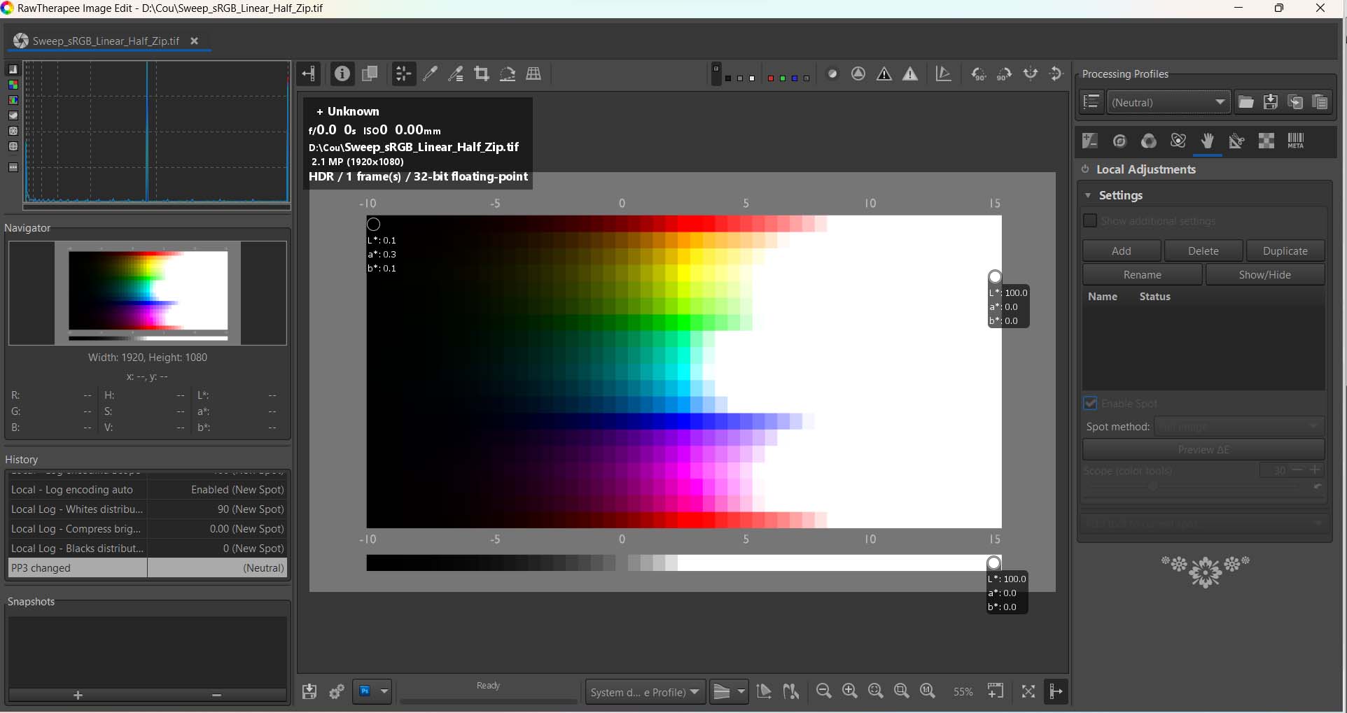- The shadows and highlights occupy the entire visible range from L=1 to L=99.8 (scale 0 – 100).